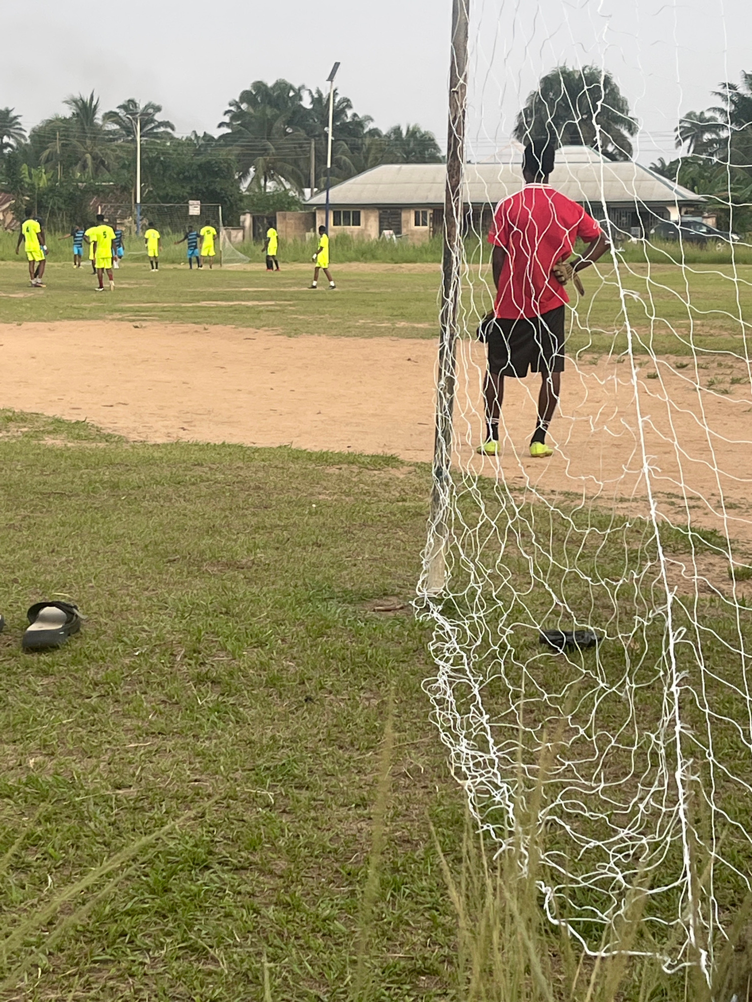 The image shows a soccer field. A man in a red shirt and black shorts stands near a net. Several other people in yellow shirts and blue shorts are in the background, on the field. The ground is covereβ¦read more