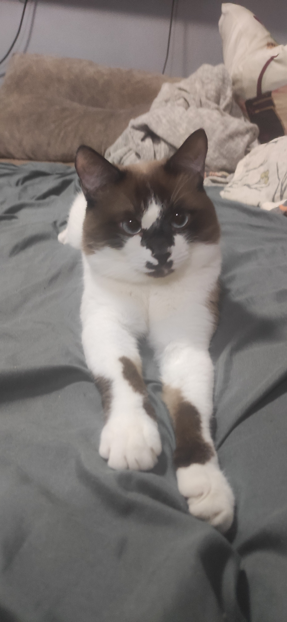 A cat lies on a grey fabric surface. The cat's fur is primarily white, with brown markings on its head, legs, and feet. The cat is looking directly at the camera. Part of a bed with pillows and linens…read more