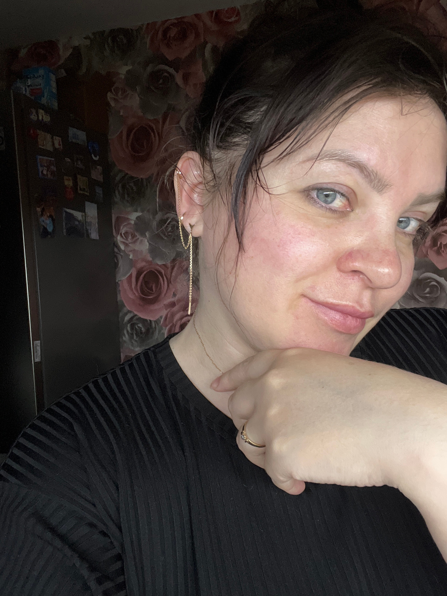 A forensic description of an indoor scene features a woman, appearing to be in her late 20s to early 30s, positioned for a close-up photograph. She has fair skin with localized redness on her cheeks a…read more