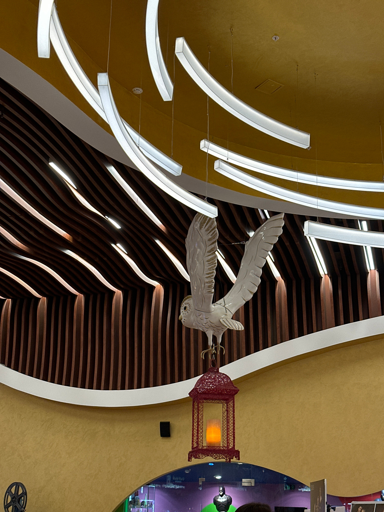The image shows an interior view in Rostov-on-Don, Russia. The scene is dominated by architectural elements, including a curved ceiling with parallel light strips running along the curvature. A decora…read more