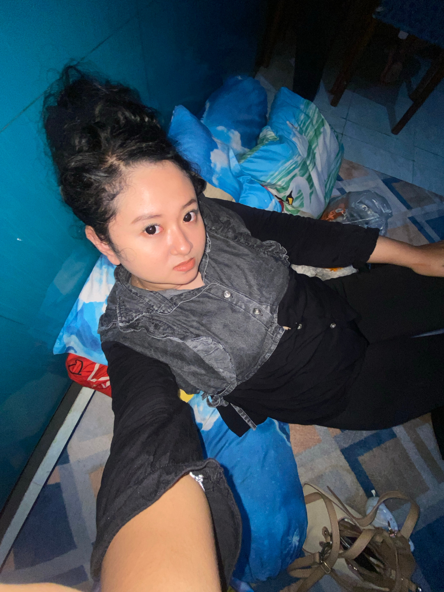 A young woman lies on her back, partially propped on blue patterned pillows. She wears black pants, a long-sleeved black shirt, and a gray denim vest. She looks directly at the camera. Her hair is bla…read more