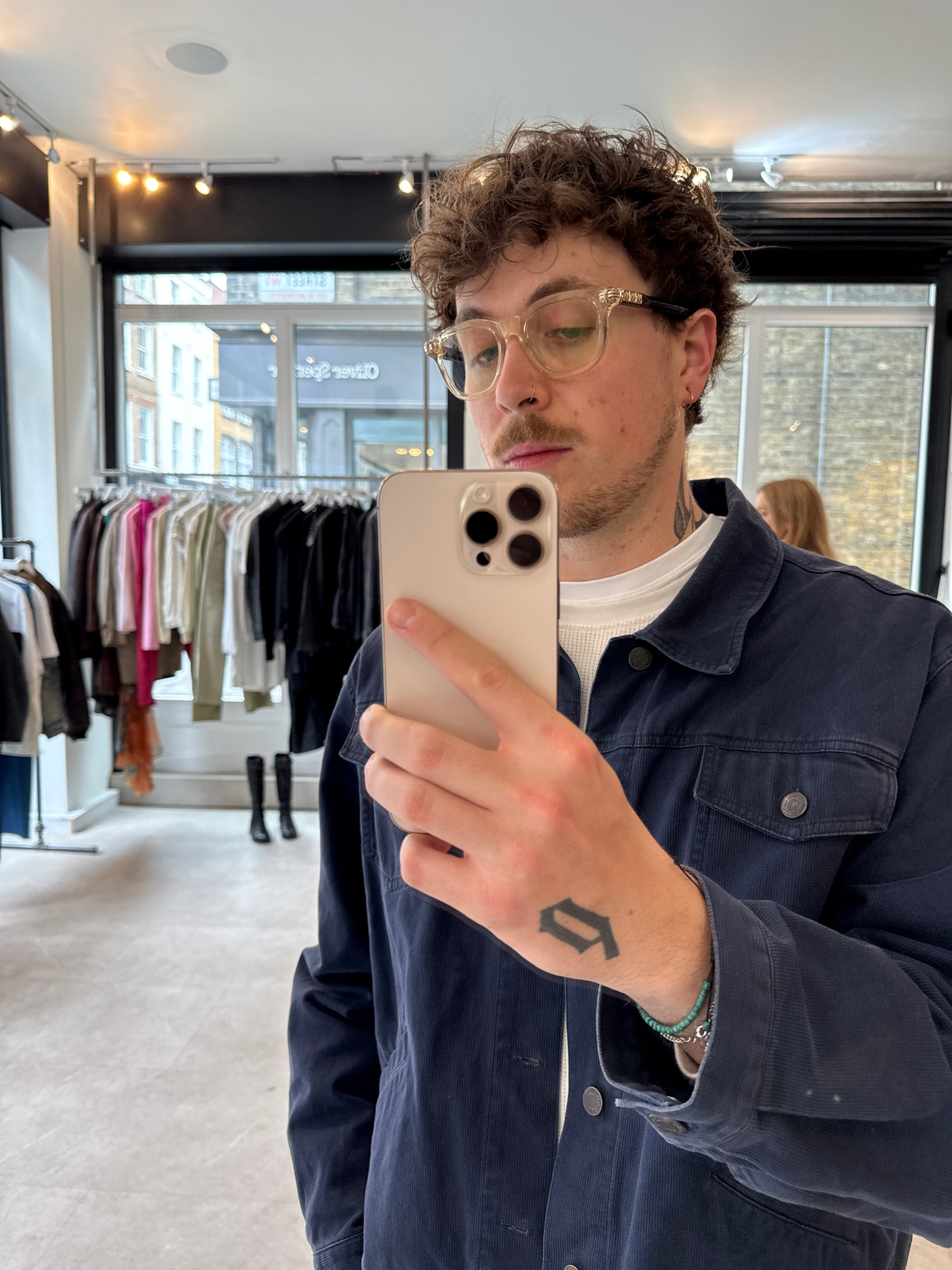 A young man takes a mirror selfie inside what appears to be a clothing retail store in London, United Kingdom. The image is rotated 90 degrees counter-clockwise. The subject is a man with dark, curly…read more