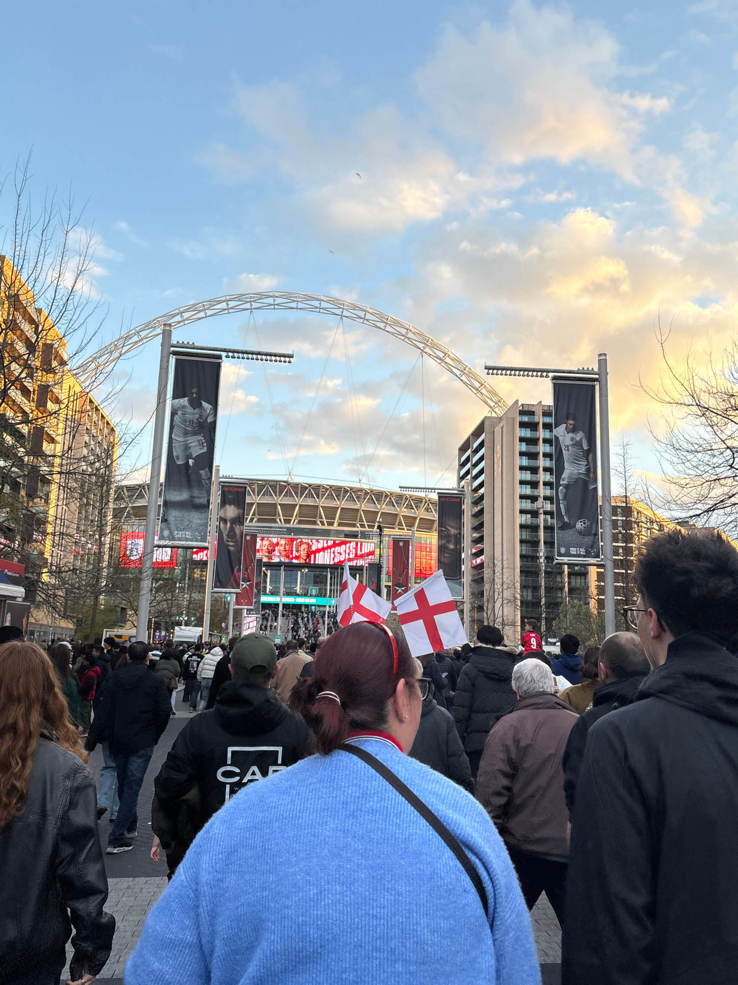 The image shows a crowd of people near Wembley Stadium in London, United Kingdom. The iconic arch of the stadium is visible in the background. The crowd includes people of various ages and ethnicities…read more