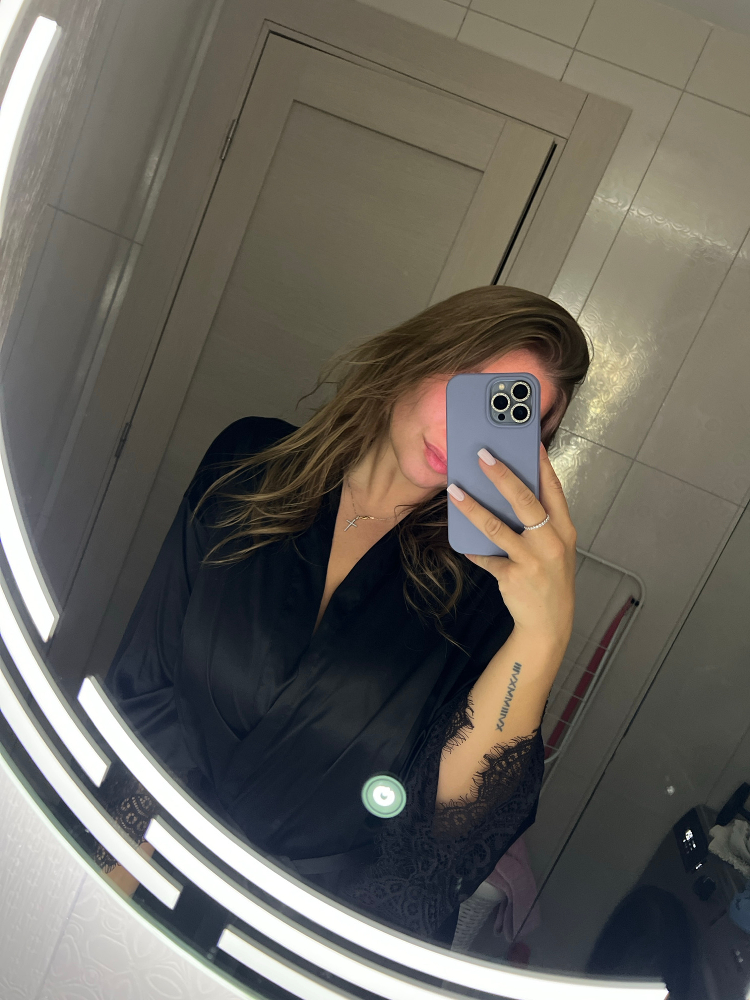 A woman in a black silk robe is taking a selfie in a bathroom in what seems to be an apartment or hotel. She is holding a light purple iPhone 13 with a ring on her finger. There is a tattoo in Roman nβ¦read more