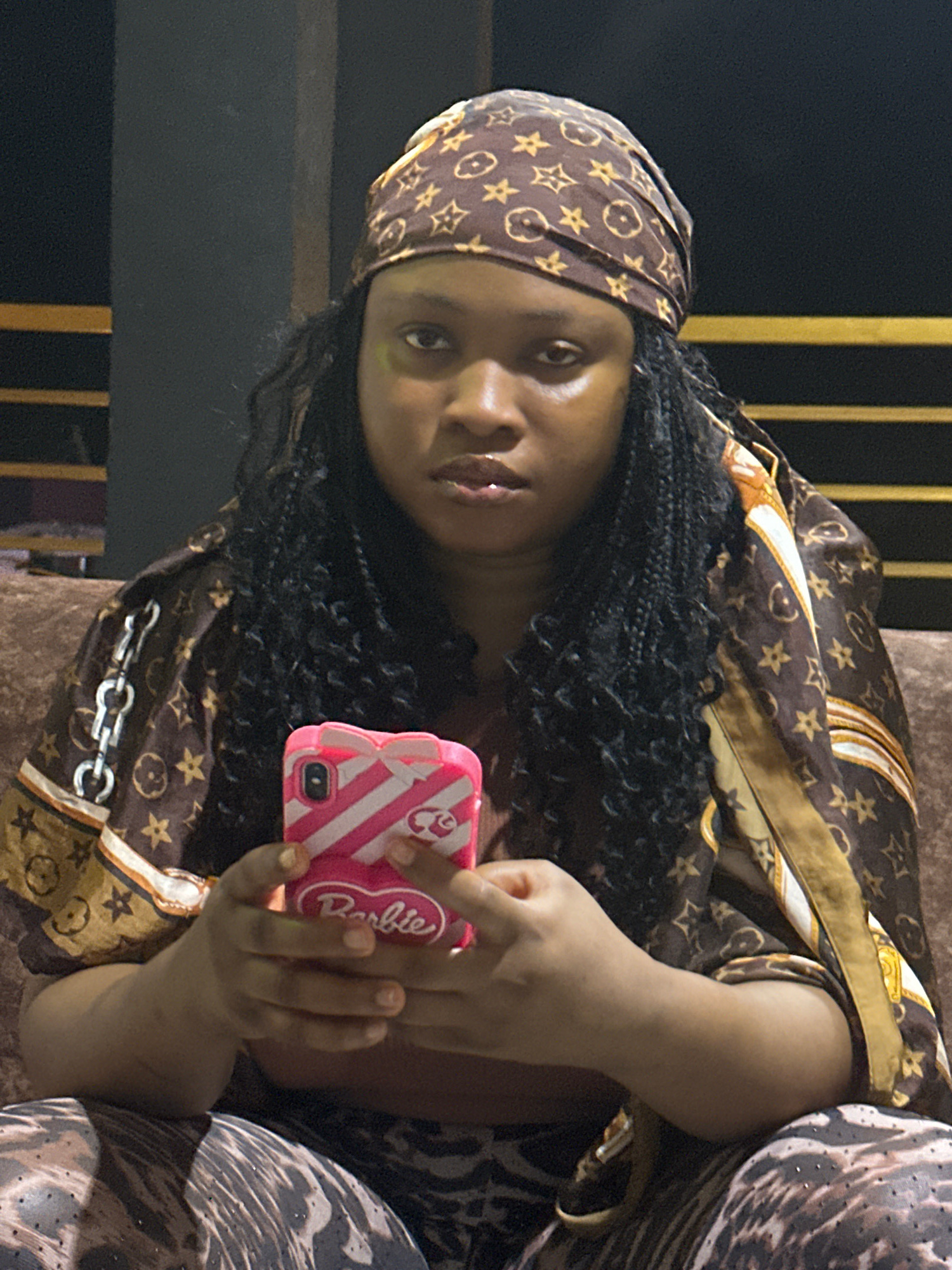 A woman is sitting, looking forward, and holding a cell phone with a pink case. She has dark hair in braids and is wearing a brown headscarf with a star and circle design. She is also wearing a brownβ¦read more