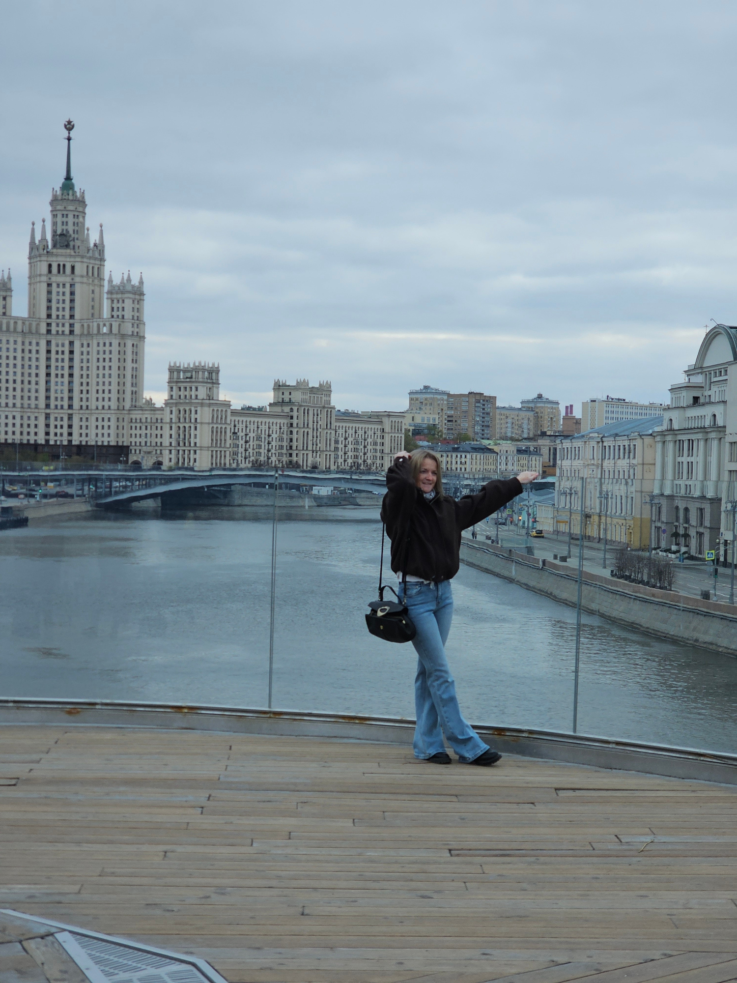 A woman is shown lying on her side in an outdoor location. She is wearing a black jacket, blue jeans, and black shoes. She is smiling and waving her right arm in the air. A black purse or bag is hangi…read more