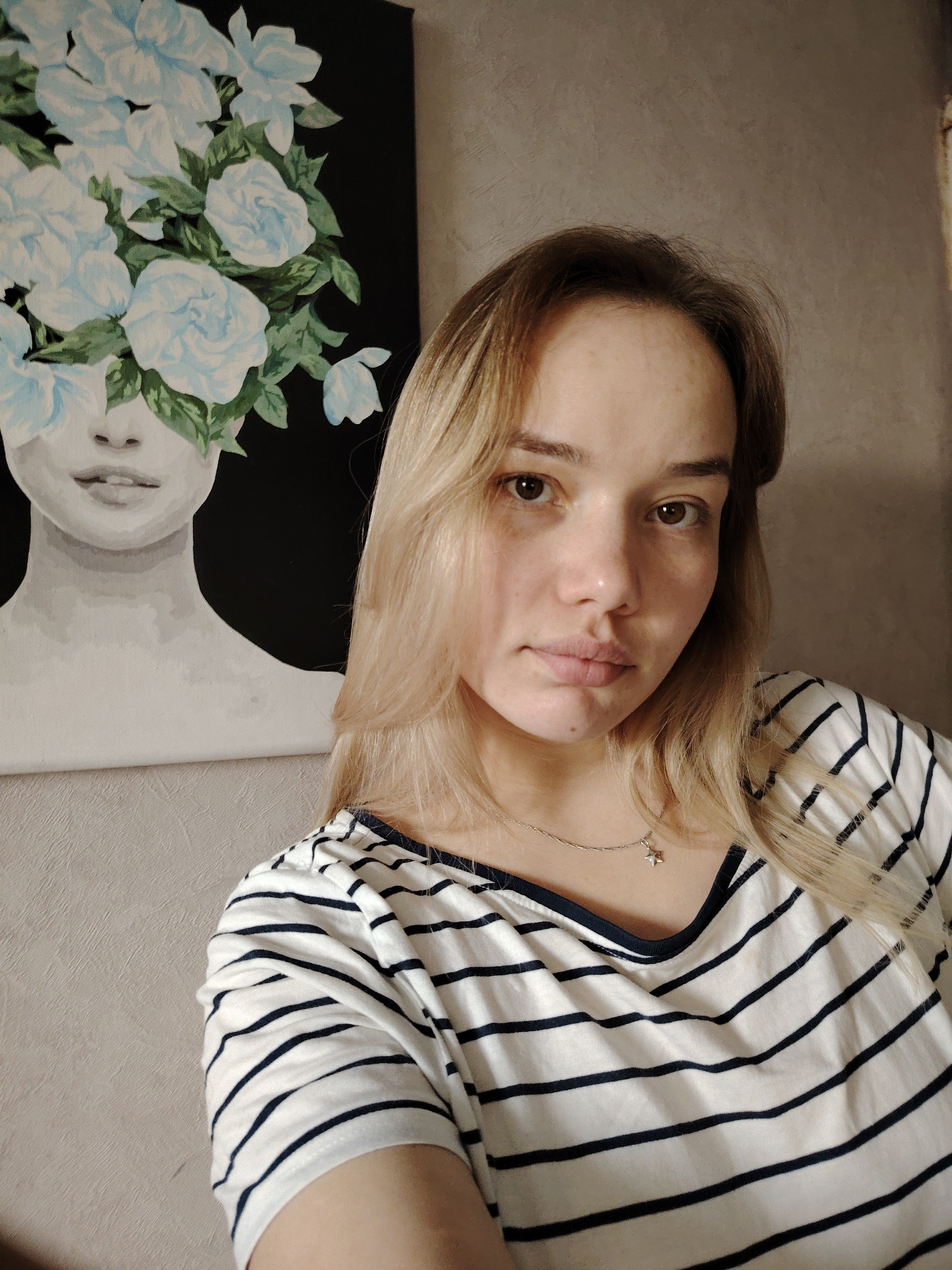 A young woman with blonde hair is pictured indoors in a close-up selfie. She is wearing a white and black striped V-neck t-shirt and a silver necklace with a star pendant. Behind her on the wall is a…read more
