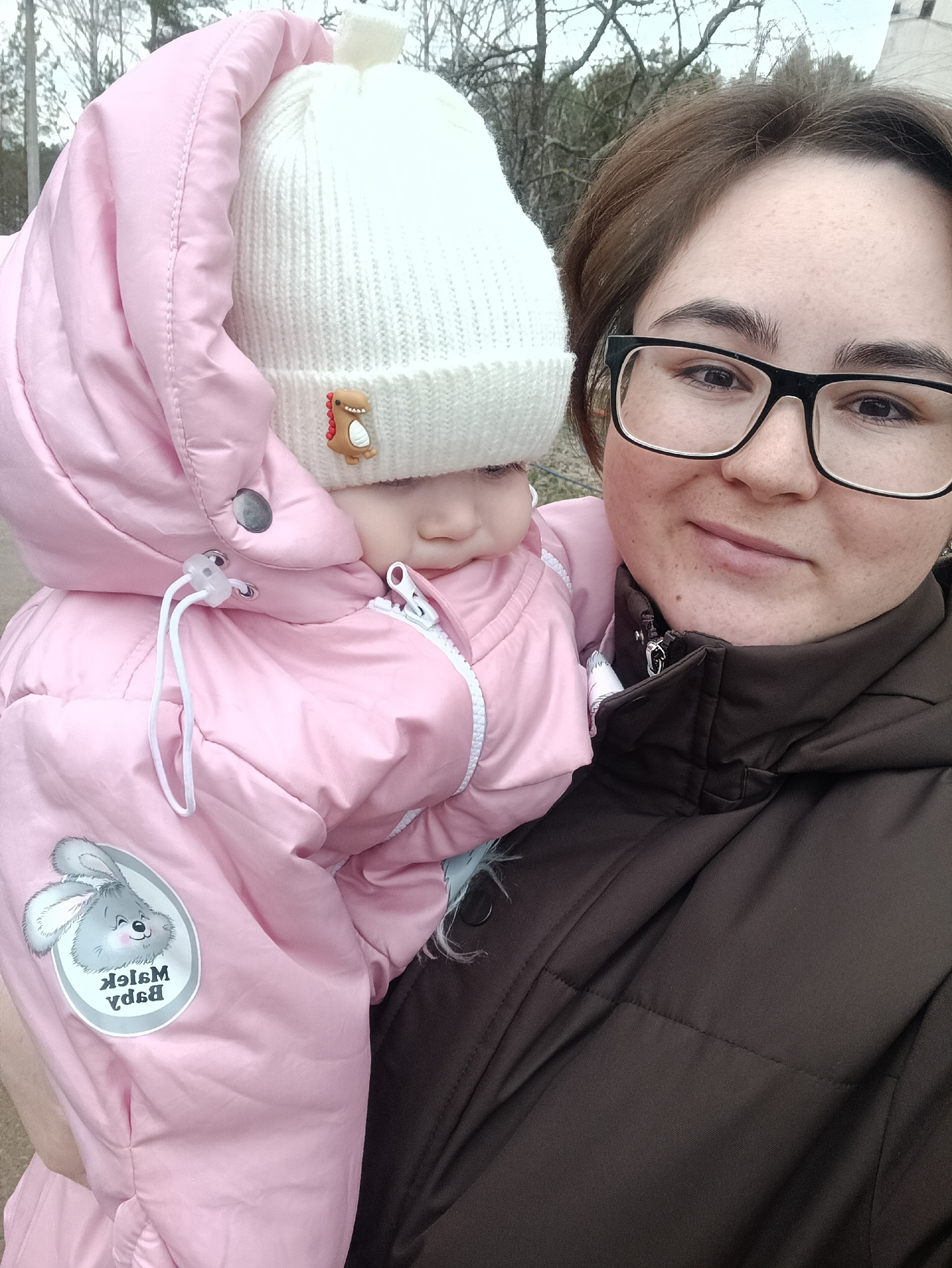A woman in eyeglasses and a brown jacket is holding a baby wearing a pink snowsuit with a white knitted hat with a dinosaur patch. The snowsuit has a patch with a cartoon rabbit and the upside-down te…read more