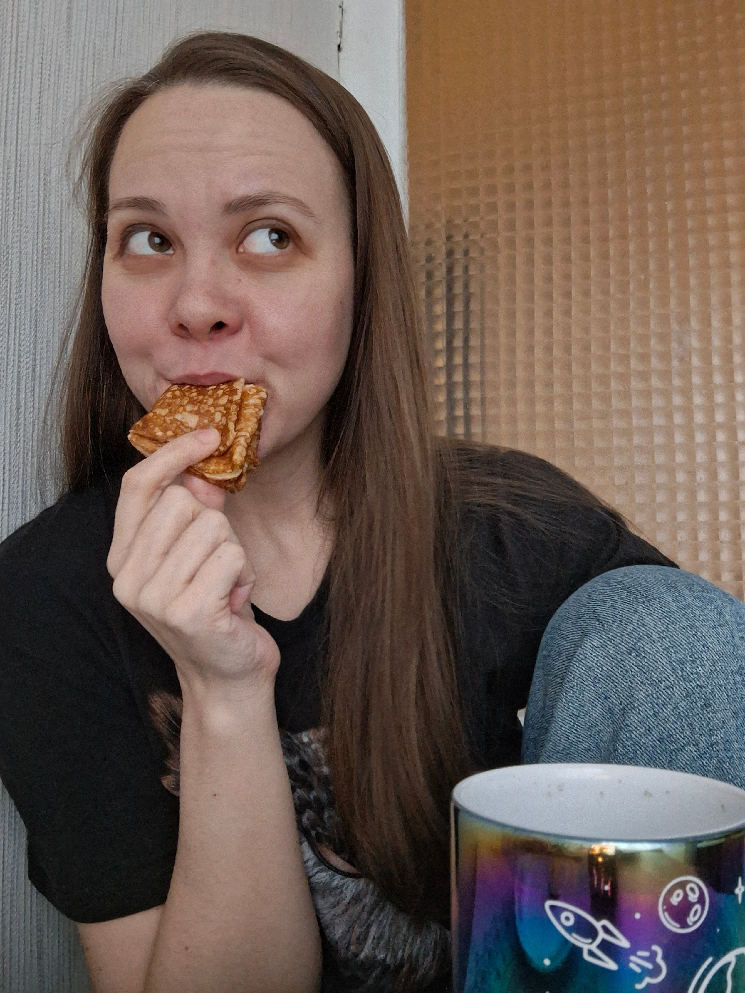 A woman is eating a crepe. She is holding the crepe in her right hand, about to take a bite. She is wearing a black t-shirt and blue jeans. There is a mug with space-themed decorations on it next to h…read more