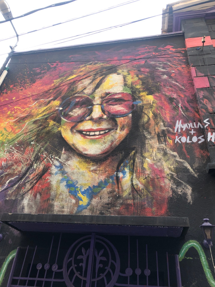 A vibrant mural depicts a person with red-tinted glasses, painted in a loose, expressive style. The background bursts with multicolored streaks and splatters. Adjacent to the mural, a decorative wroug…read more