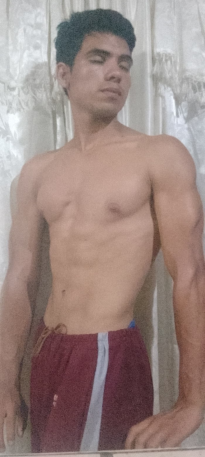 A young adult male is depicted in a medium-close-up shot, standing against a light-colored, vertically textured fabric background. The subject is bare-chested, displaying a muscular physique, and wearβ¦read more