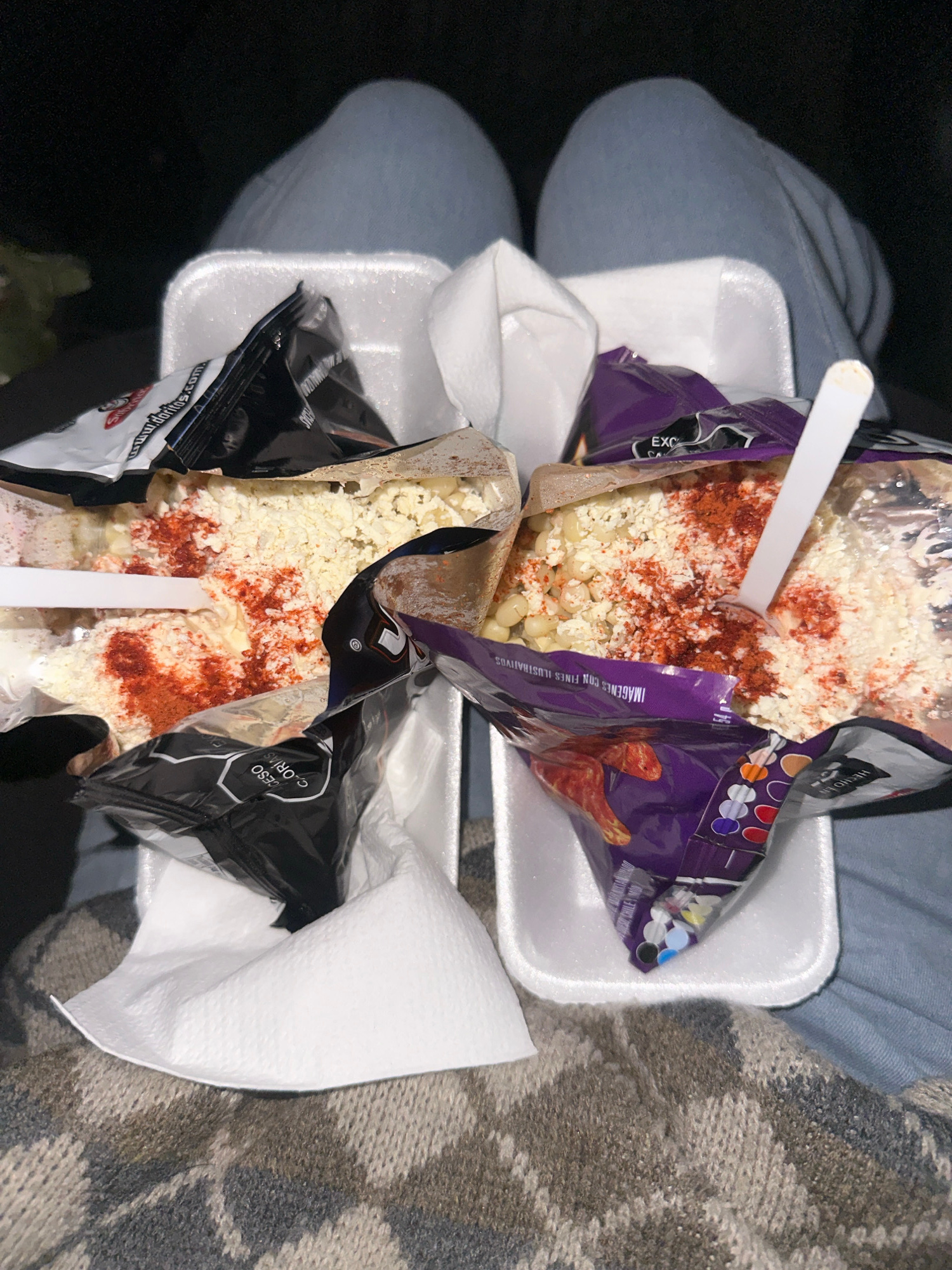 Here is a description of the image: The image shows two servings of "elotes" or Mexican street corn. Each serving is in a clear plastic bag, placed in a white styrofoam container. The elote is topped…read more