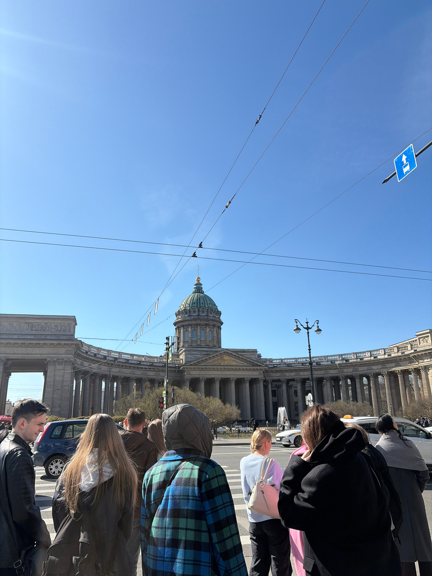 This daytime street scene captures a vibrant urban environment in Saint Petersburg, Russia, with the iconic Kazan Cathedral prominently featured. The image, originally rotated 90 degrees, depicts a cl…read more