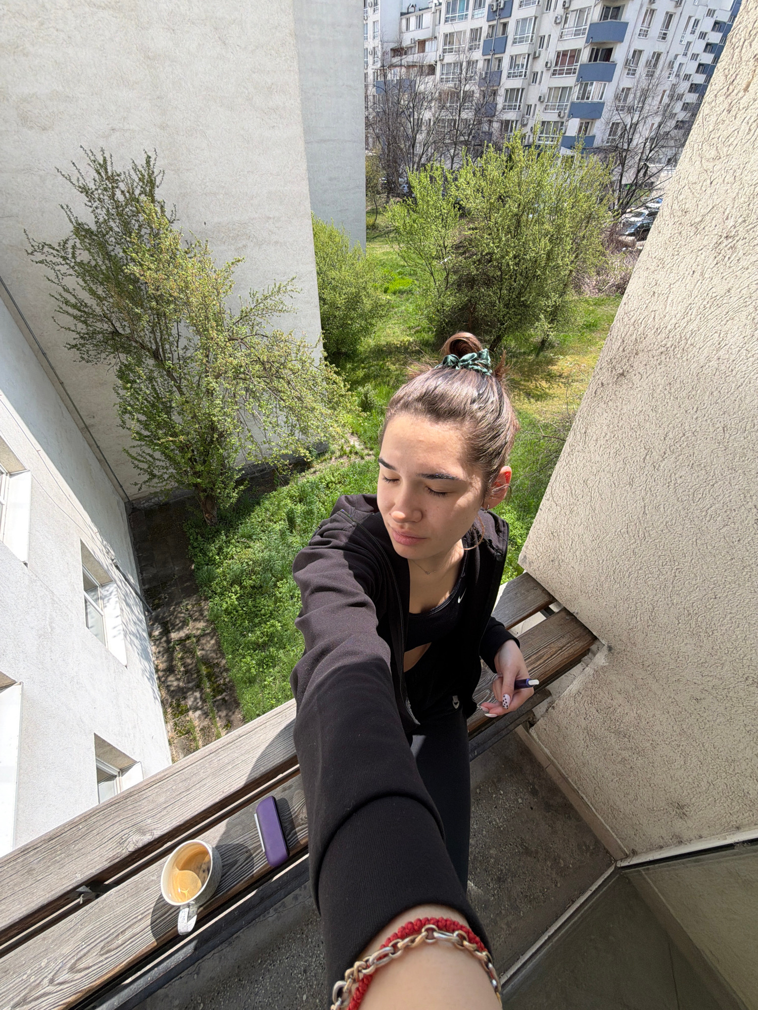 A medium, eye-level shot depicts a woman in a black hooded sweatshirt seated on a wooden balcony. She has dark hair tied in a bun with a green scrunchie. She holds a pen in her right hand. On the balc…read more