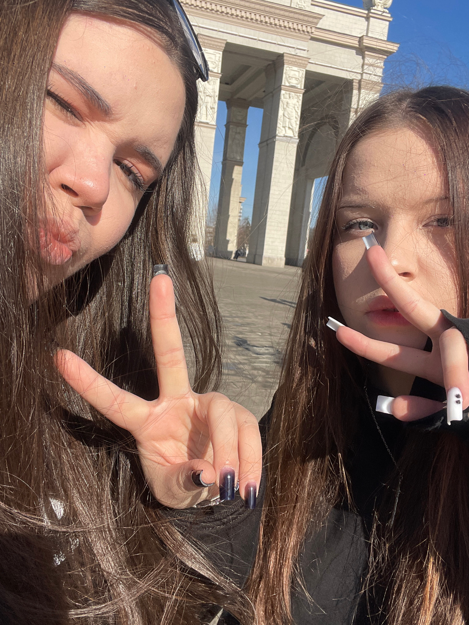 Two young women pose for a selfie. The woman in the upper portion of the frame makes a "peace sign" with long white, ghost-themed acrylic nails. The woman in the lower portion of the frame makes a similar hand gesture with long dark blue acrylic nails. The background reveals a building with classical architecture, with possible stone columns. The image may have been taken near the Khimki Park Culture and Leisure in Khimki, Russia. | Open Wire
