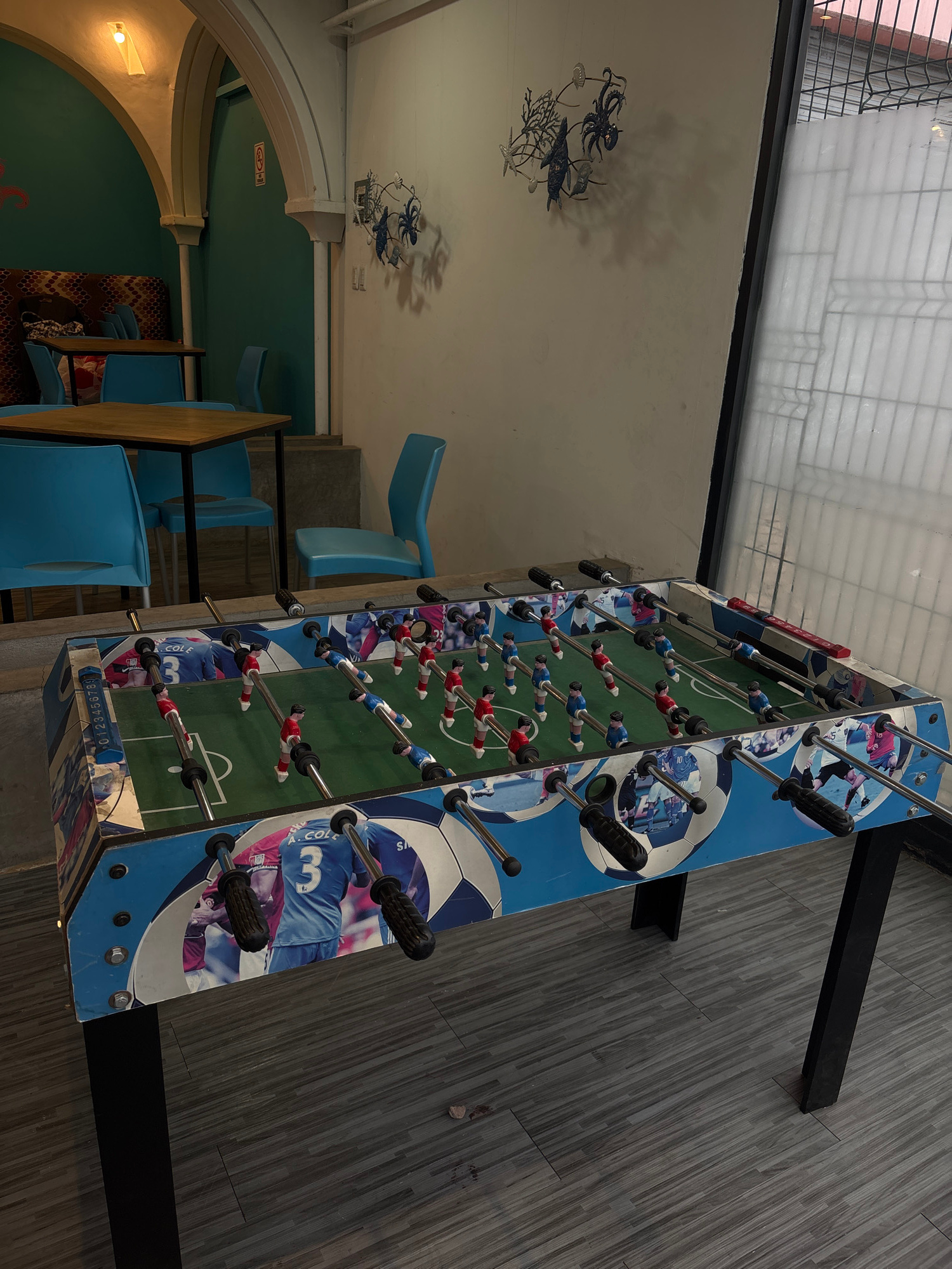 The image shows a foosball table in a room with a quirky decor. The foosball table is blue with images of soccer players and soccer balls printed on its sides. It has the typical rows of foosball play…read more