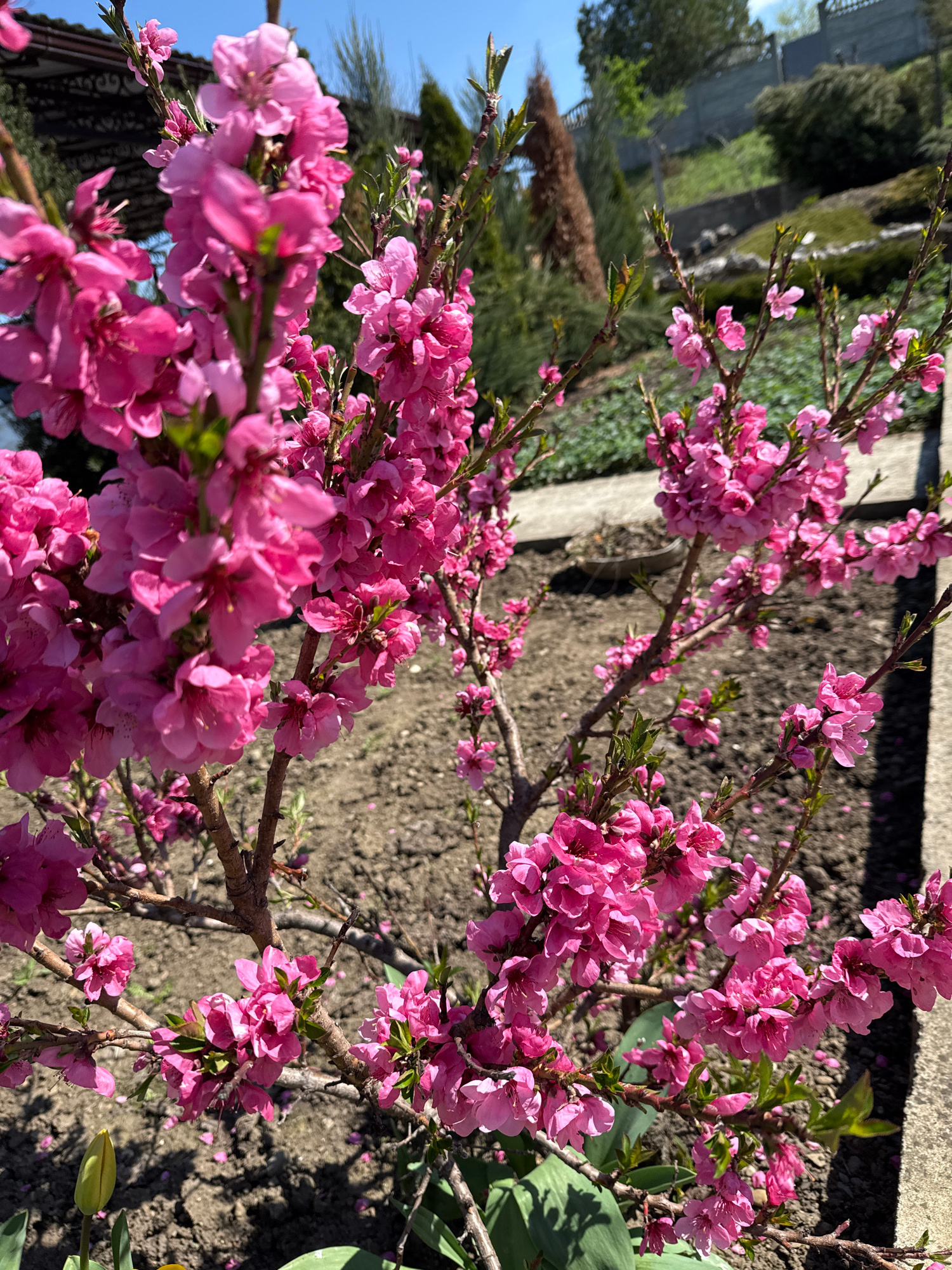 A close-up, ground-level shot captures a blooming ornamental tree with vibrant pink flowers. The tree's branches are laden with blossoms, which dominate the foreground. The ground around the tree is…read more