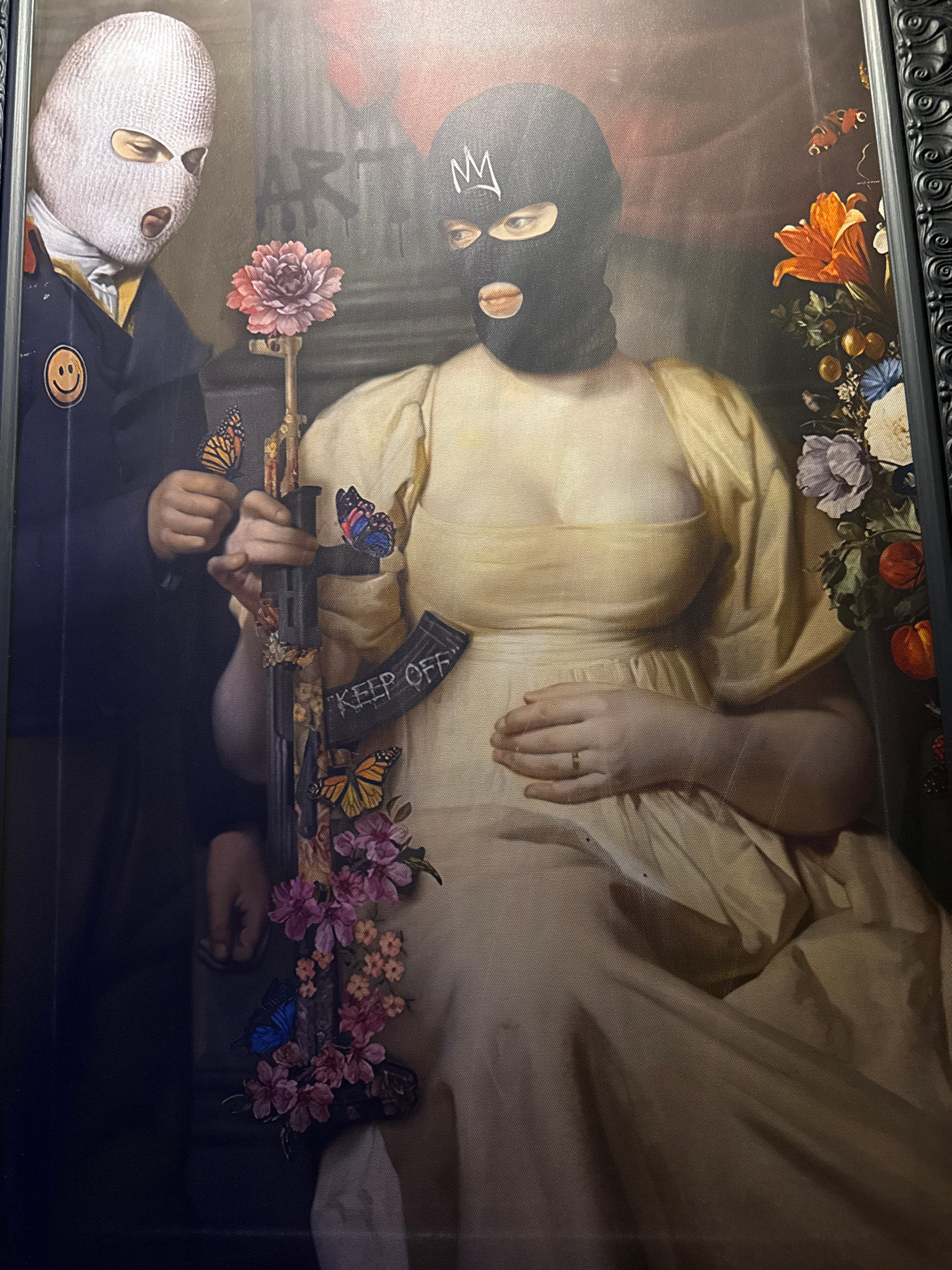 The image is a framed print hanging indoors. It depicts two figures wearing ski masks. The upper figure wears a black ski mask with a crown symbol and a yellow gown. The figure is holding a rifle decoβ¦read more