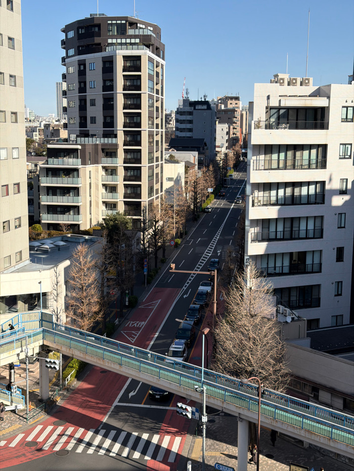 This image presents an elevated view of a bustling urban street scene, likely taken from a high floor of a building. The perspective looks down onto a complex arrangement of modern architecture, roads…read more