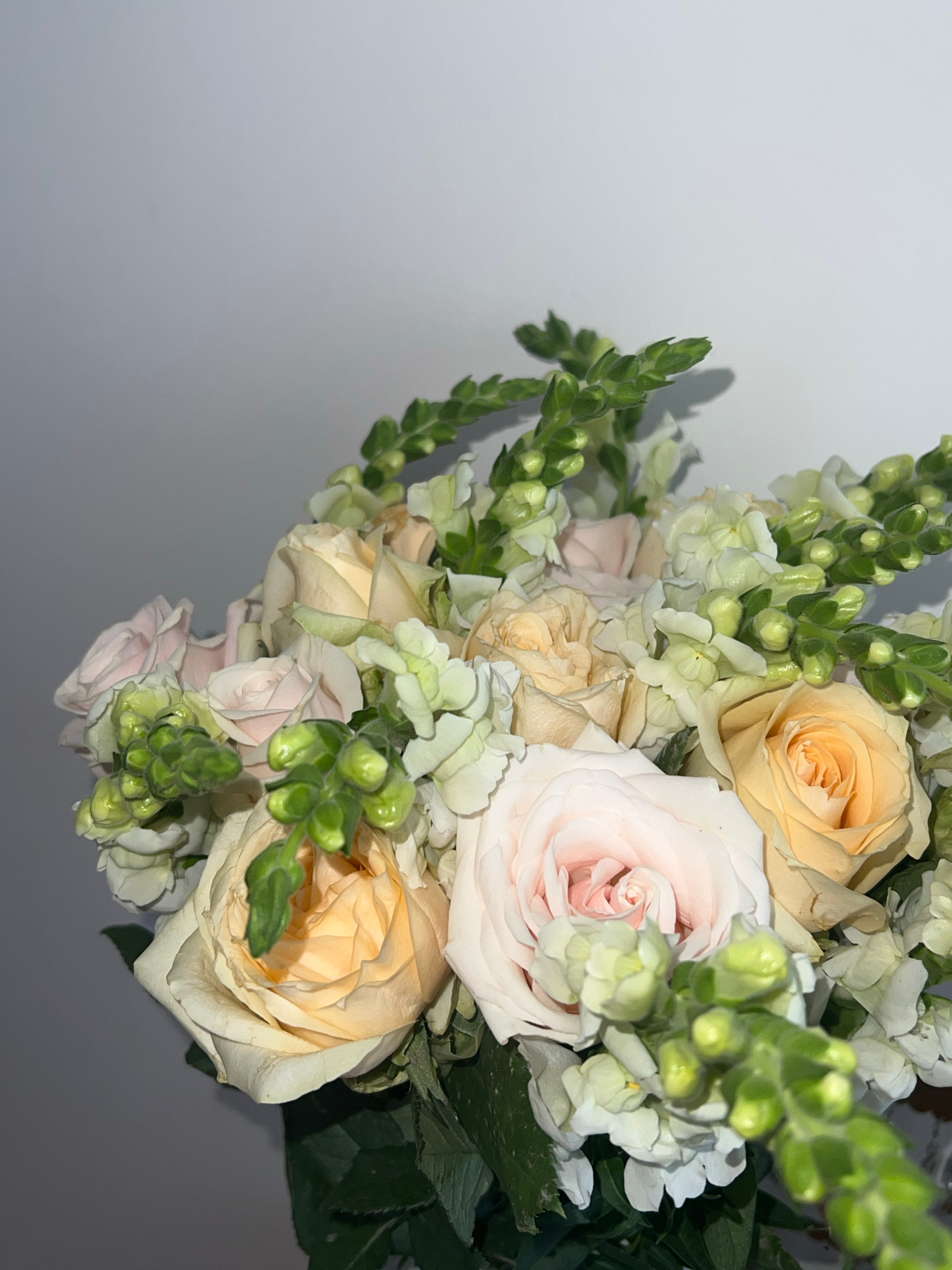 A high-angle, medium shot shows a bouquet of flowers against a plain, light-colored background, likely a wall or surface. The bouquet consists of roses in shades of peach and pale pink, interspersed w…read more