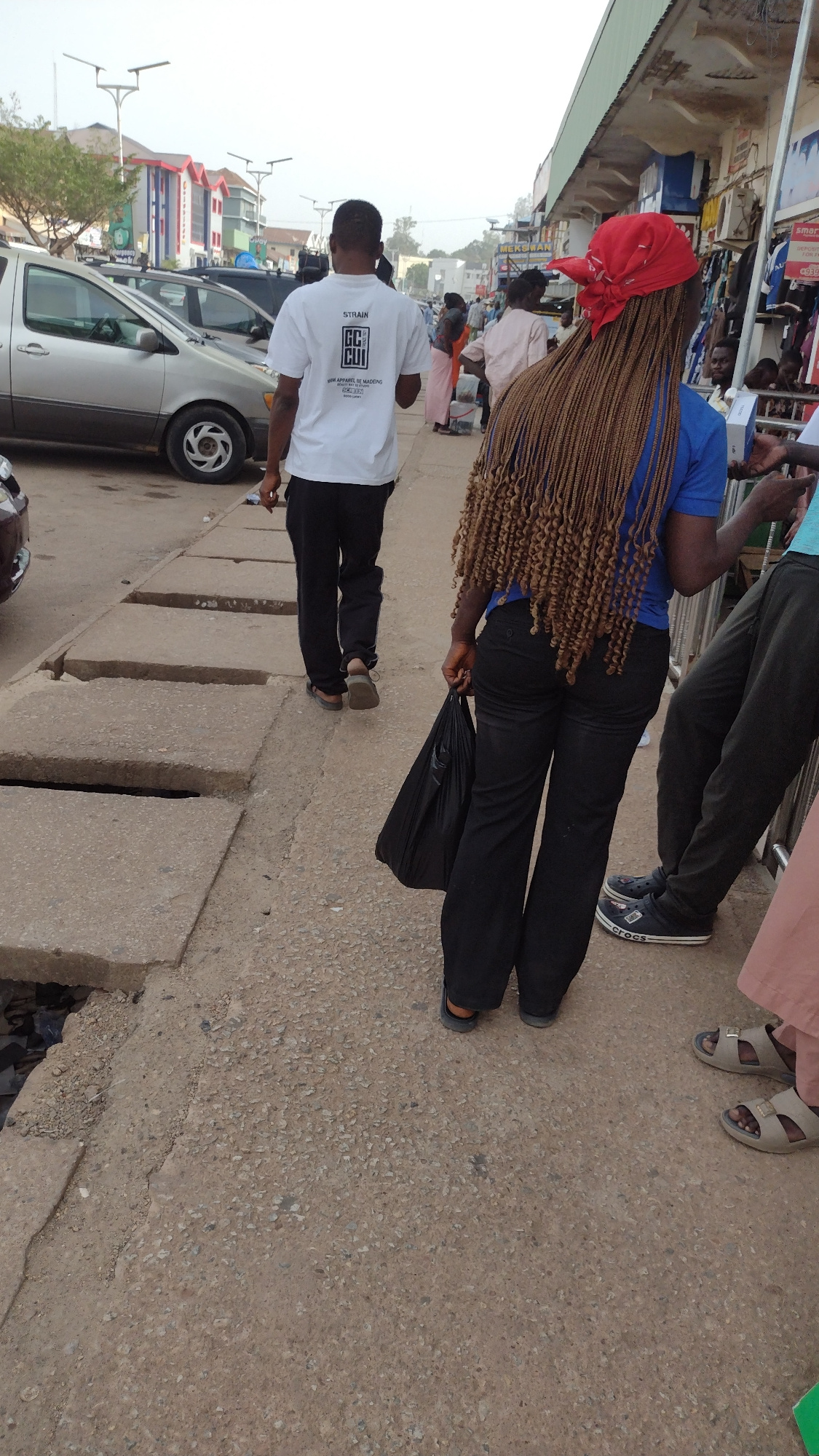 The image shows a street scene in Jos, Nigeria. A woman with long, light brown braids and a red headscarf is standing on the sidewalk. She is wearing a blue shirt and black pants and holding a black p…read more