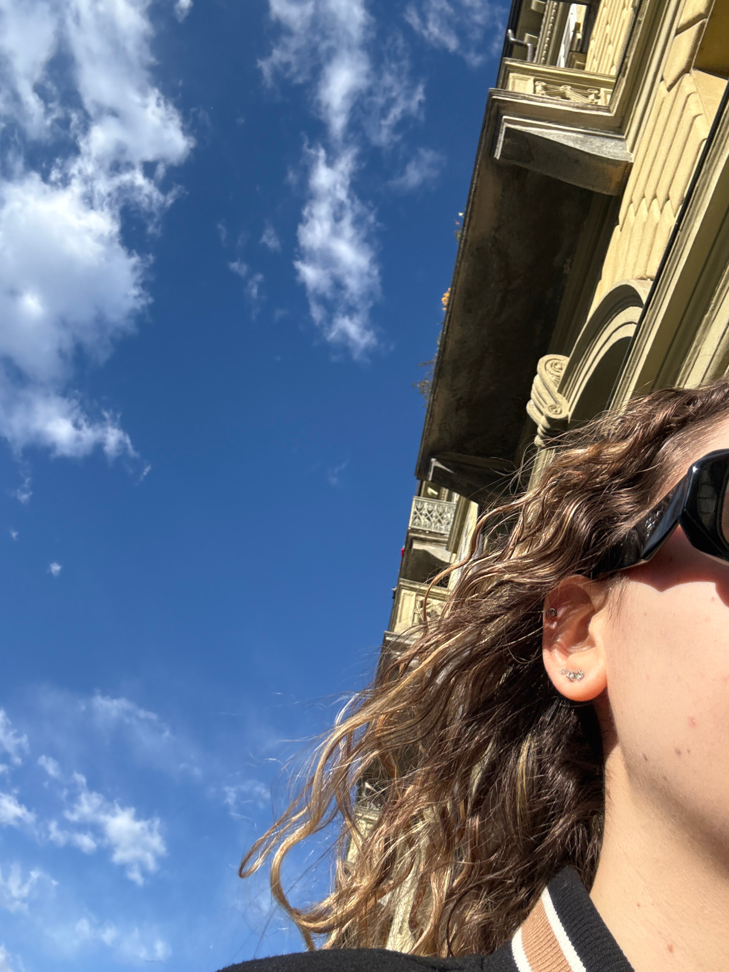 The image, taken from a low angle, features a partial view of a person with wavy, light brown hair, sunglasses, and multiple piercings in their ear. A building with ornate, classical architectural det…read more