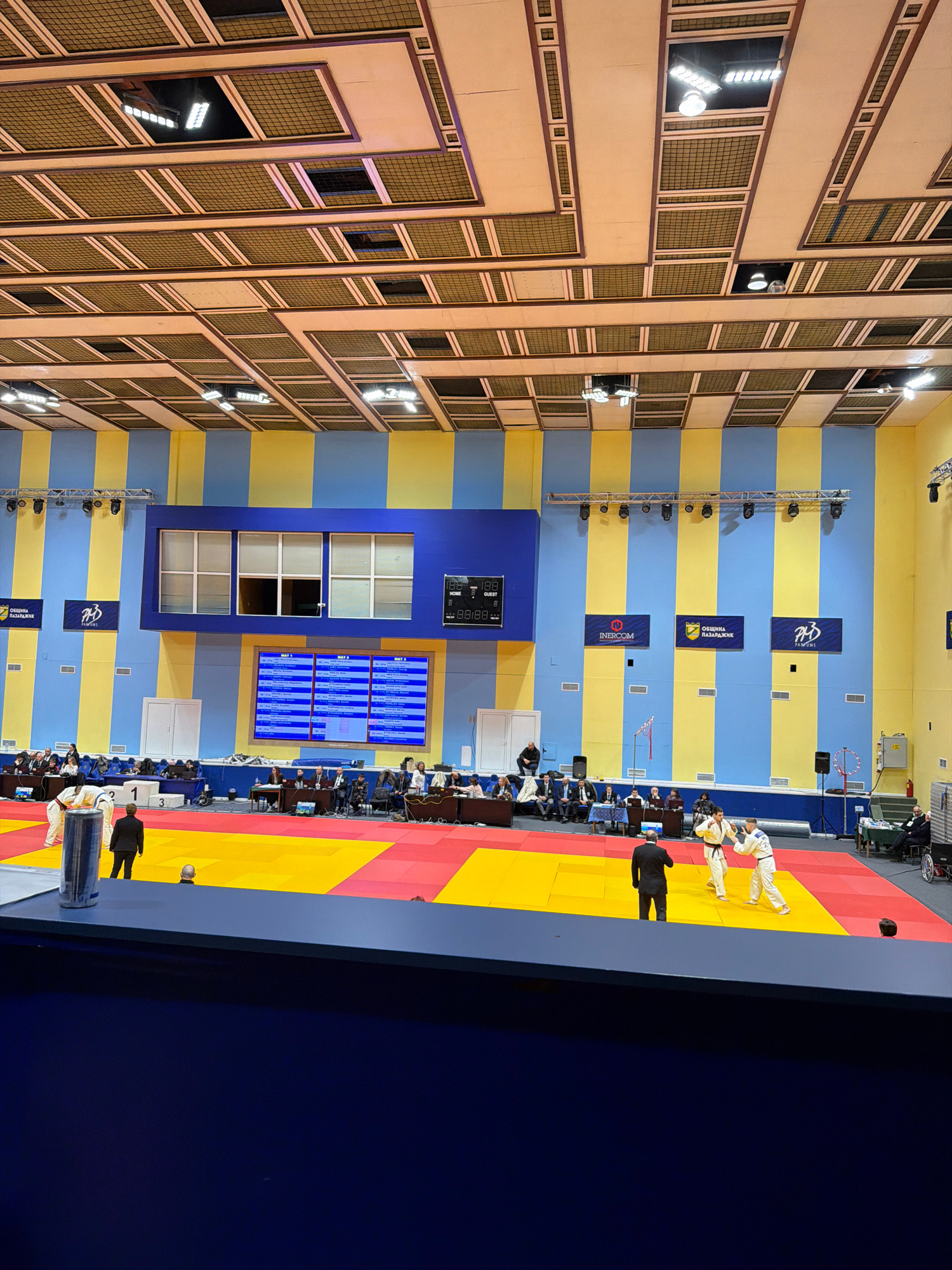 The image shows an indoor judo competition in Pazardzhik, Bulgaria. The judo mat is red and yellow. Two judokas in white judogis are engaged in combat. Referees are overseeing the match. Spectators an…read more