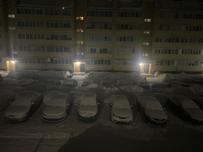 The scene depicts a snow-covered residential area at night in Noviy, Russia. Two multi-story apartment buildings, light yellow in color, dominate the background, featuring numerous windows, some of wh…read more
