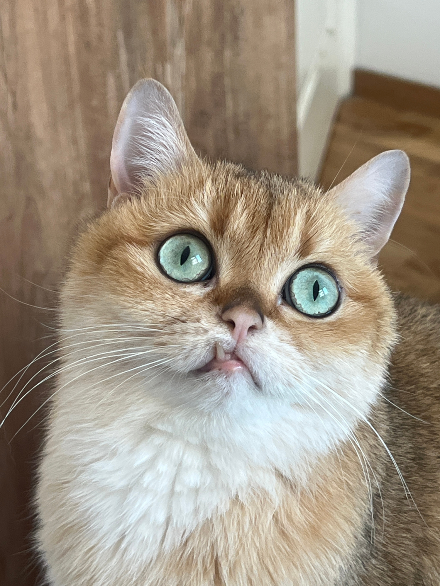 A close-up, medium-shot, eye-level perspective photograph depicts a brown and white British Shorthair cat. The cat's head is tilted slightly downward and to the left. Its eyes are large and bright gre…read more