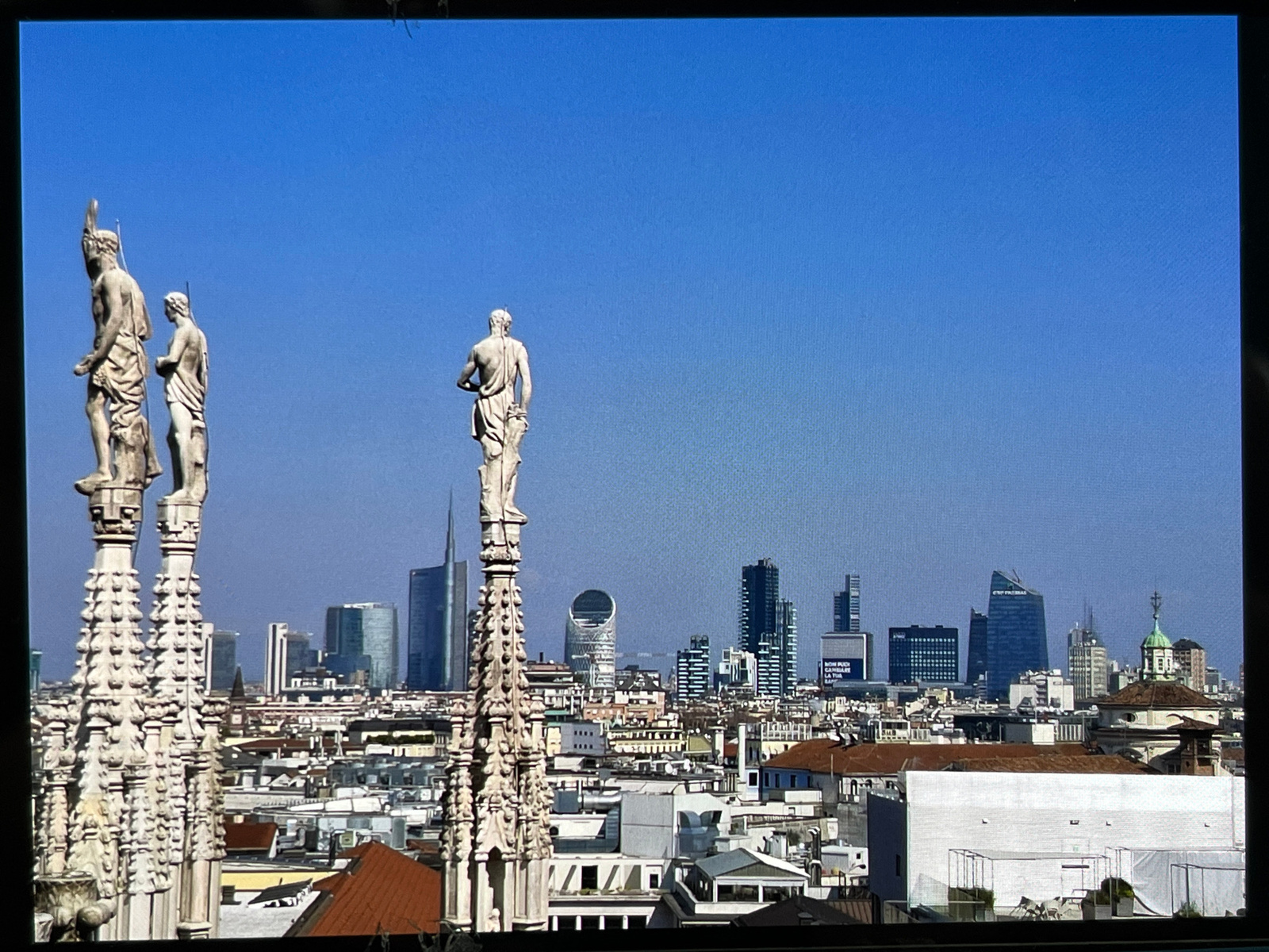 The image presents a cityscape under a clear blue sky, dominated by various architectural structures. In the foreground, three ornate spires topped with classical sculptures are visible, framing the bβ¦read more