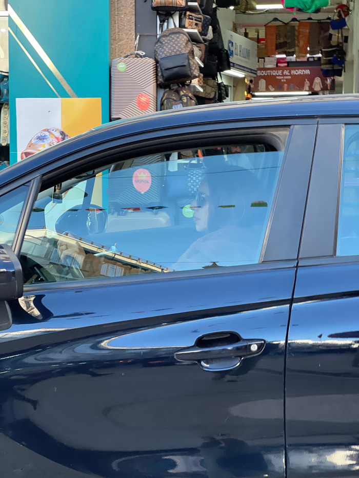 This image captures a static street scene in Tanger, Morocco, observed from the perspective of a vehicle. The foreground features the dark blue driver's side of a car, encompassing both the front and…read more