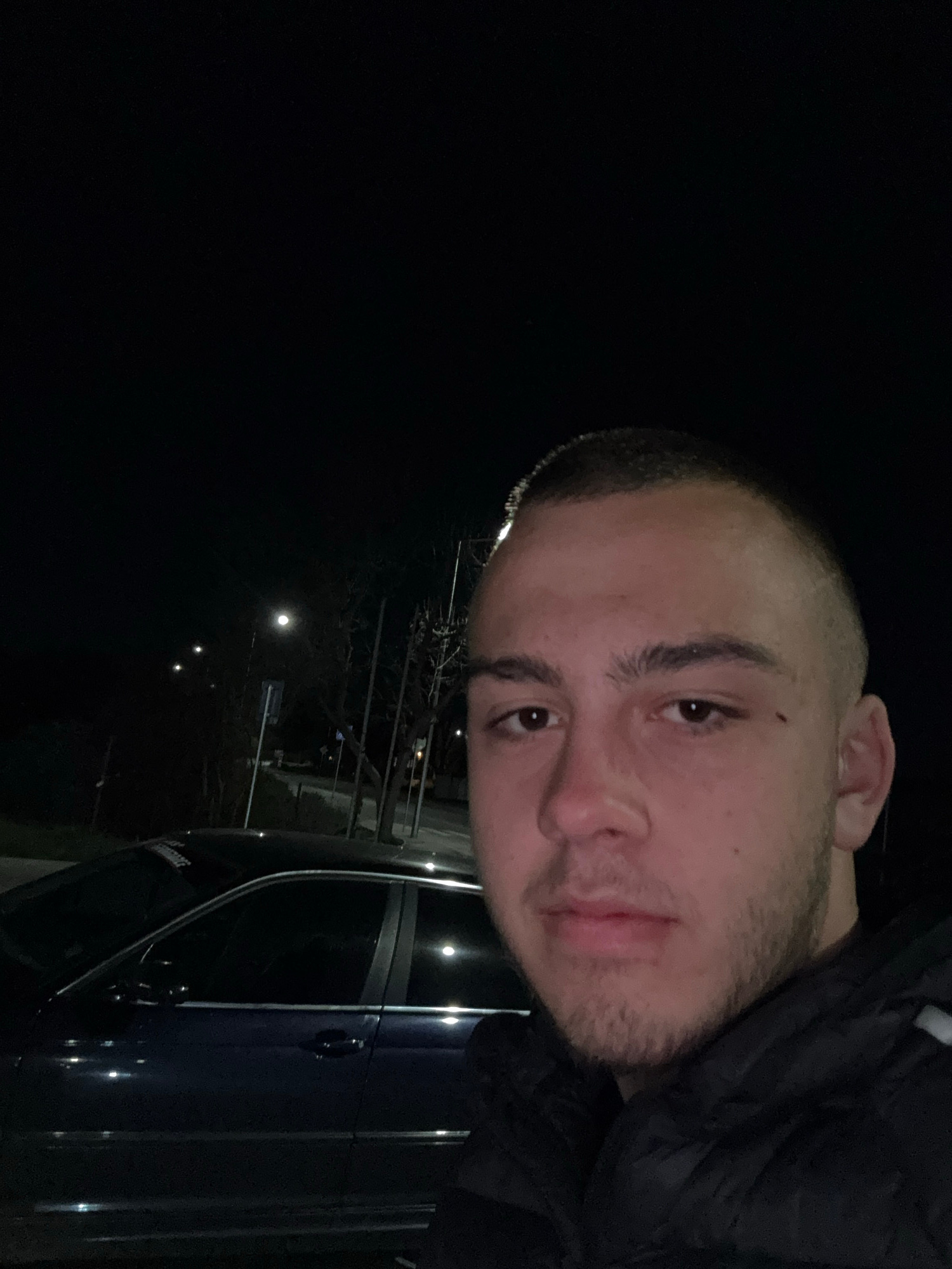 A man with closely cropped hair and a beard is visible in the foreground. He is wearing a dark jacket. To his right is a dark vehicle with a visible door handle. In the background, several street ligh…read more