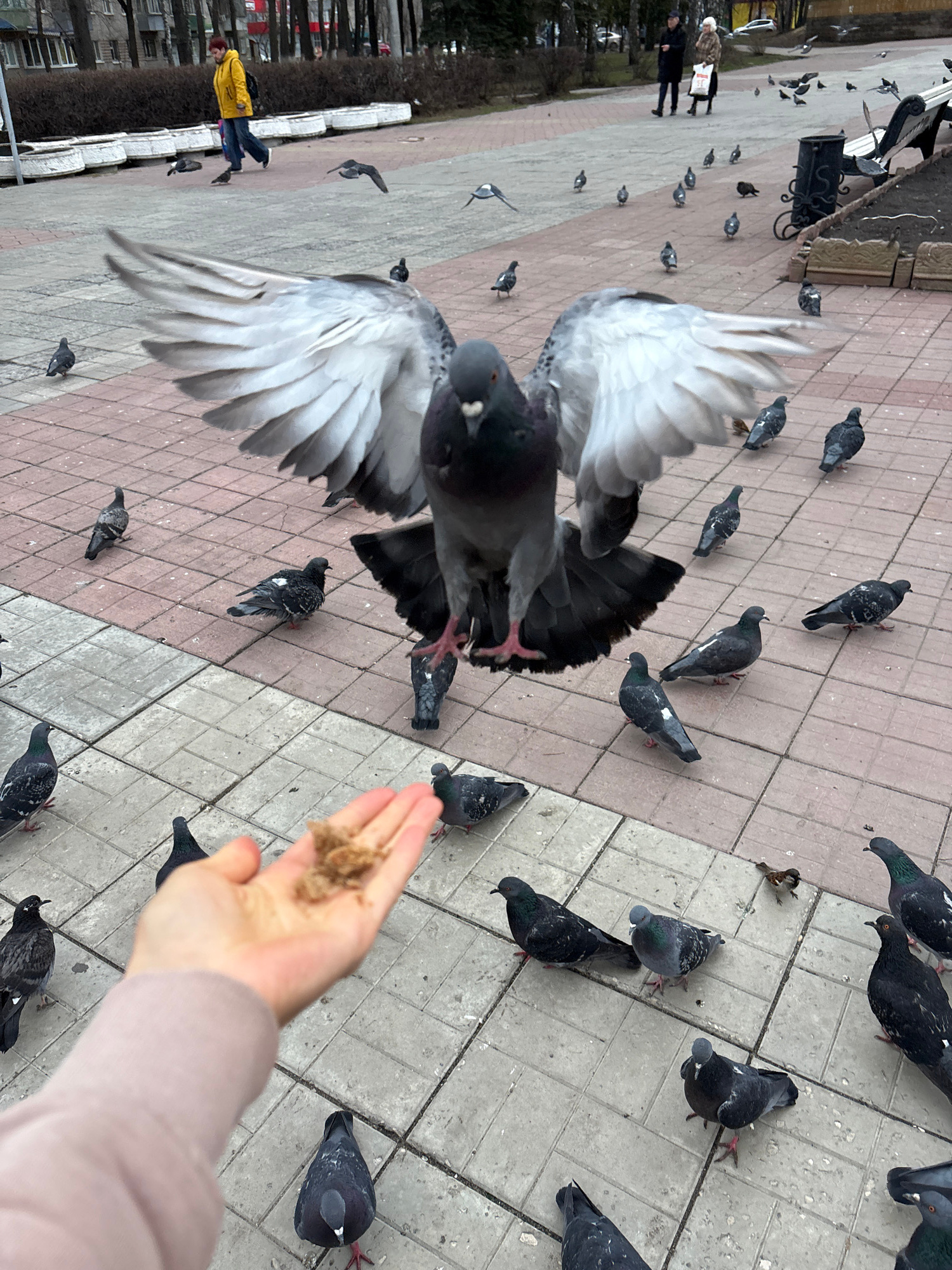 The image shows a first-person view of a person feeding pigeons in what appears to be a city park. Many pigeons are visible, some on the ground and one in mid-flight with its wings fully extended. The…read more