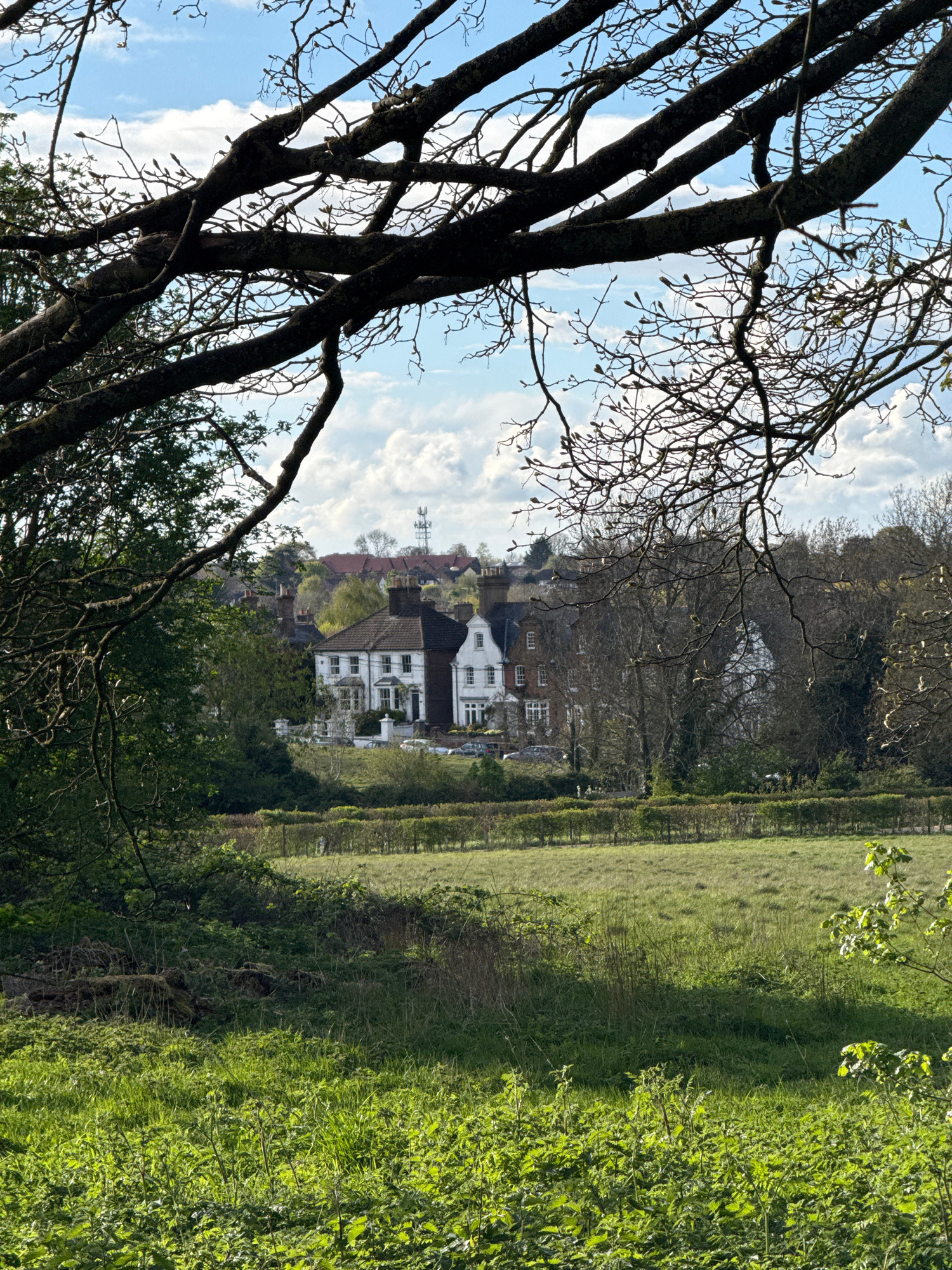 The image depicts a landscape scene in Dacorum, United Kingdom. The foreground features a dark, bare tree on the left, contrasted against a blue sky with scattered white clouds visible through its braβ¦read more