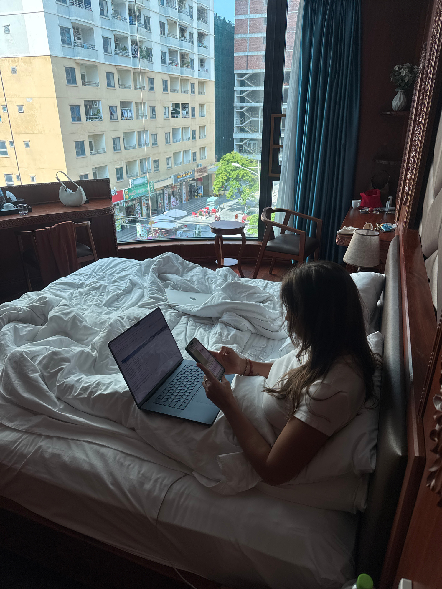 A person sits in a bed covered in white bedding with a laptop on the bed and a mobile phone in their hand. The person has long brown hair and is wearing a white shirt. A large window behind the person…read more