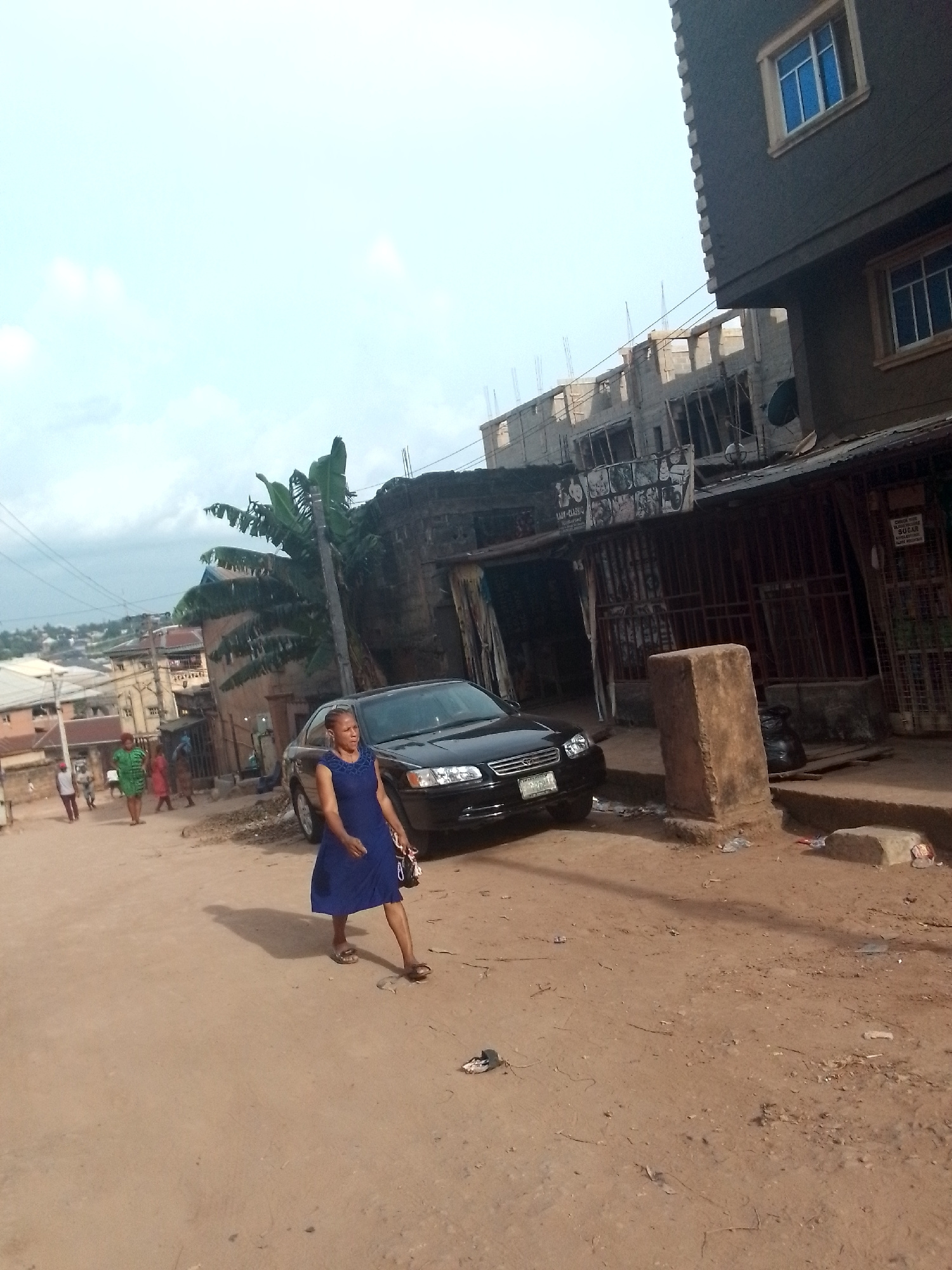 The image depicts a street scene in Onitsha, Nigeria. The street is unpaved, appearing as dirt or reddish soil. A woman in a blue dress walks along the street. A black car is parked near a building. S…read more