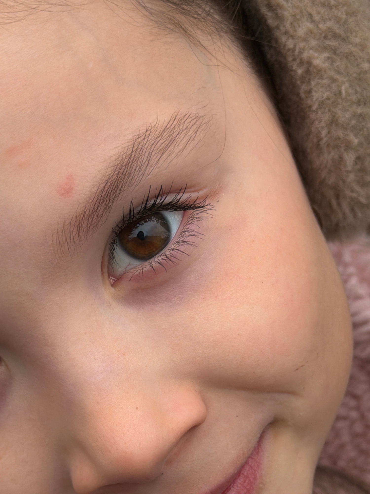 A close-up image shows the face of a young person, likely a child, lying on their side. The focus is on their eye, which is brown with long eyelashes. There is a light brown fuzzy material, possibly a…read more
