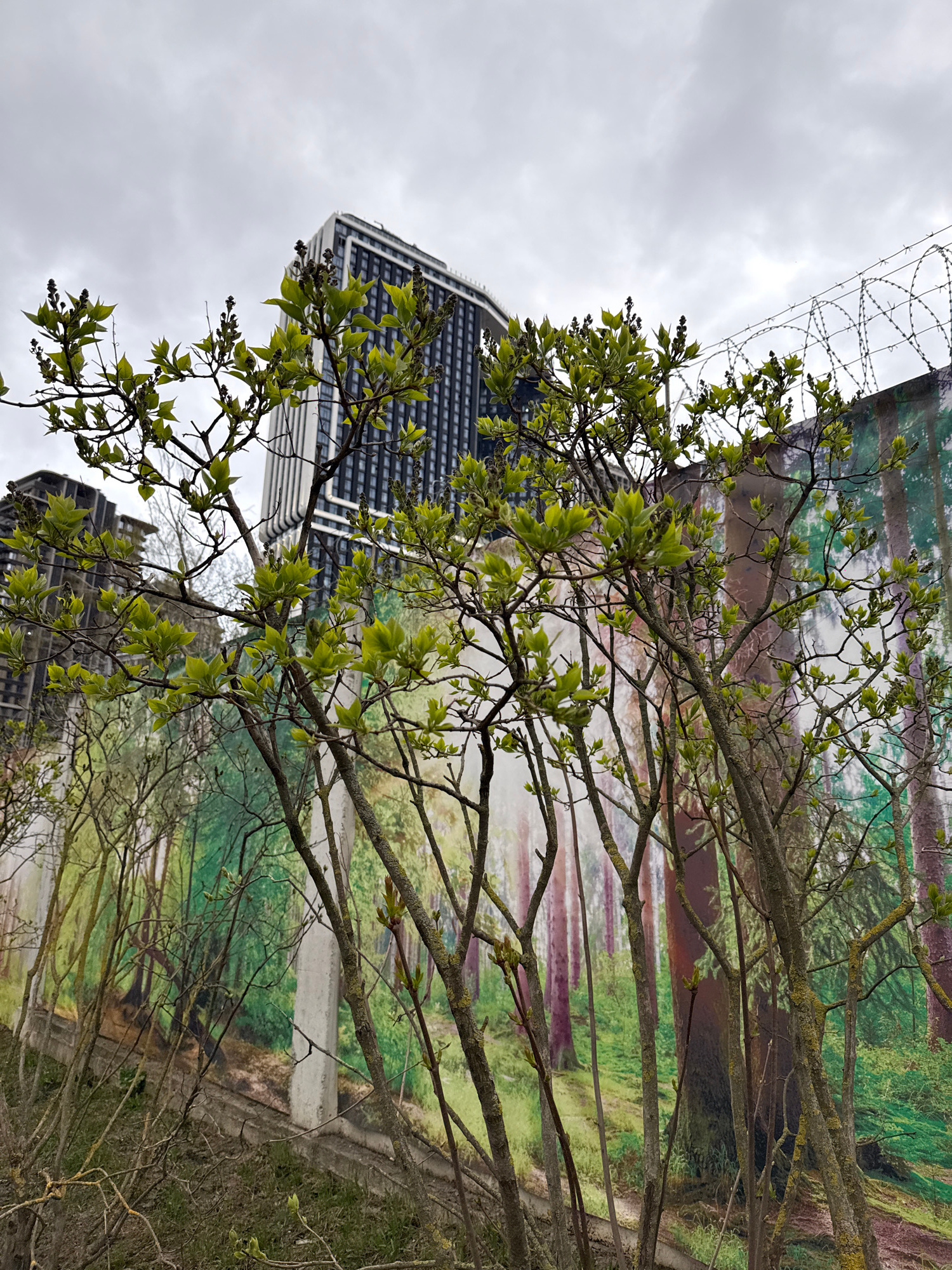 The image shows a view of a city landscape in Khimki, Russia. In the foreground, there are branches of a tree with fresh green leaves and some emerging buds. In the background, there is a modern high-…read more