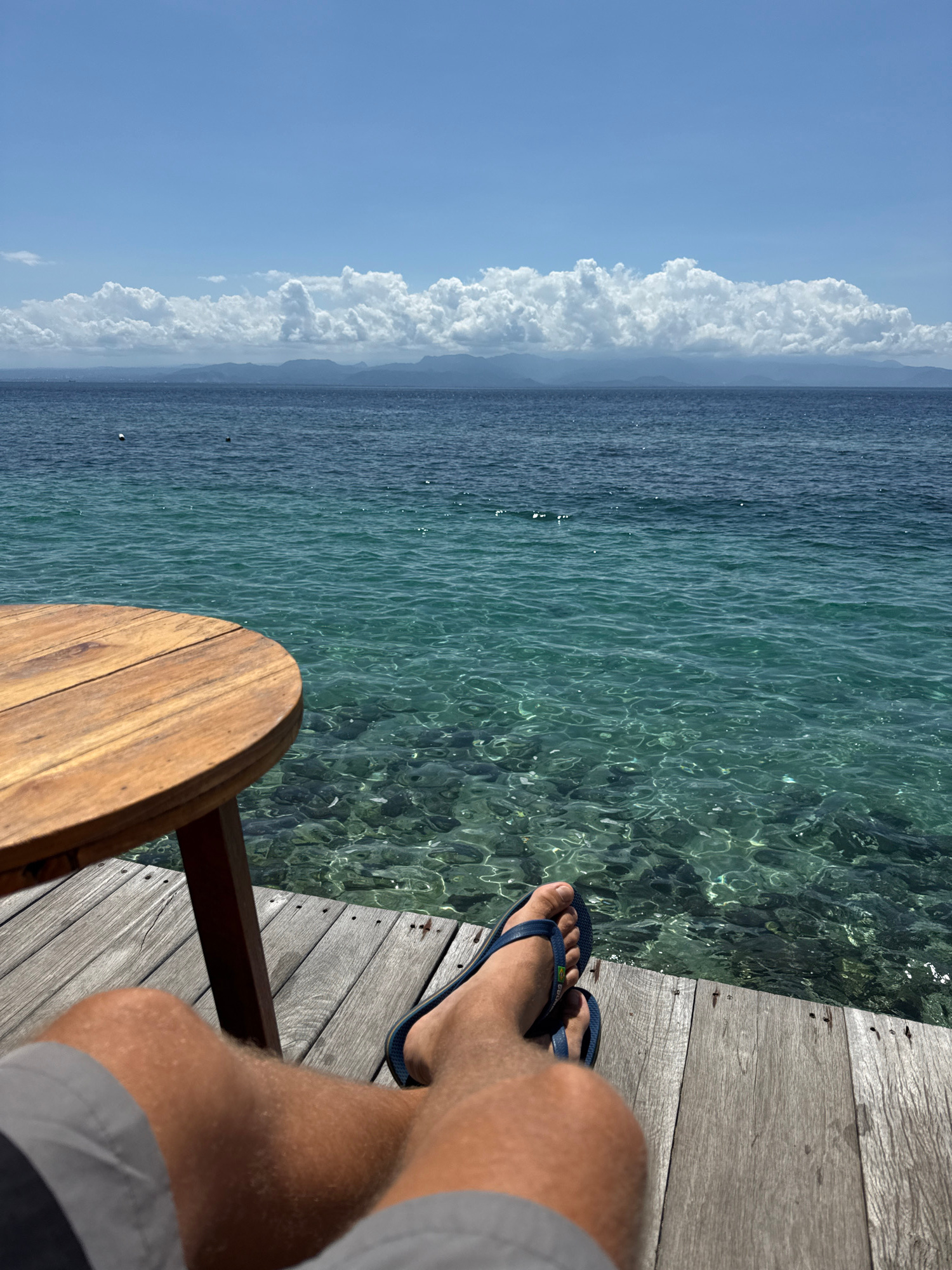 From a first-person perspective, the image captures a serene waterfront scene. A person wearing blue flip-flops is sitting on a wooden dock. The clear, turquoise water reveals the seabed beneath. To t…read more