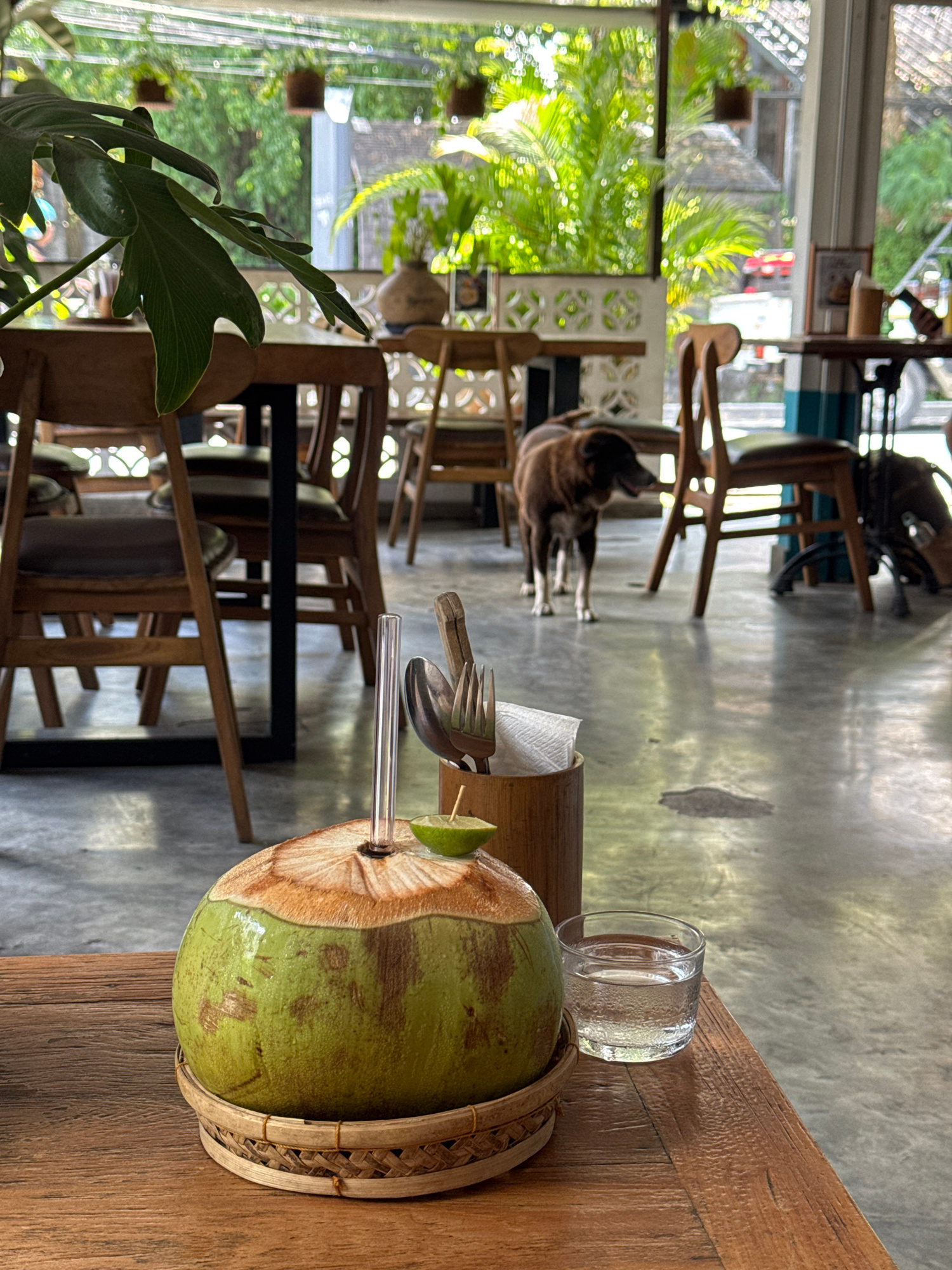 The image depicts the interior of a cafe or restaurant in North Kuta, Indonesia. In the foreground, on a wooden table, sits a green coconut drink with a clear straw, a small glass of water, and utensi…read more