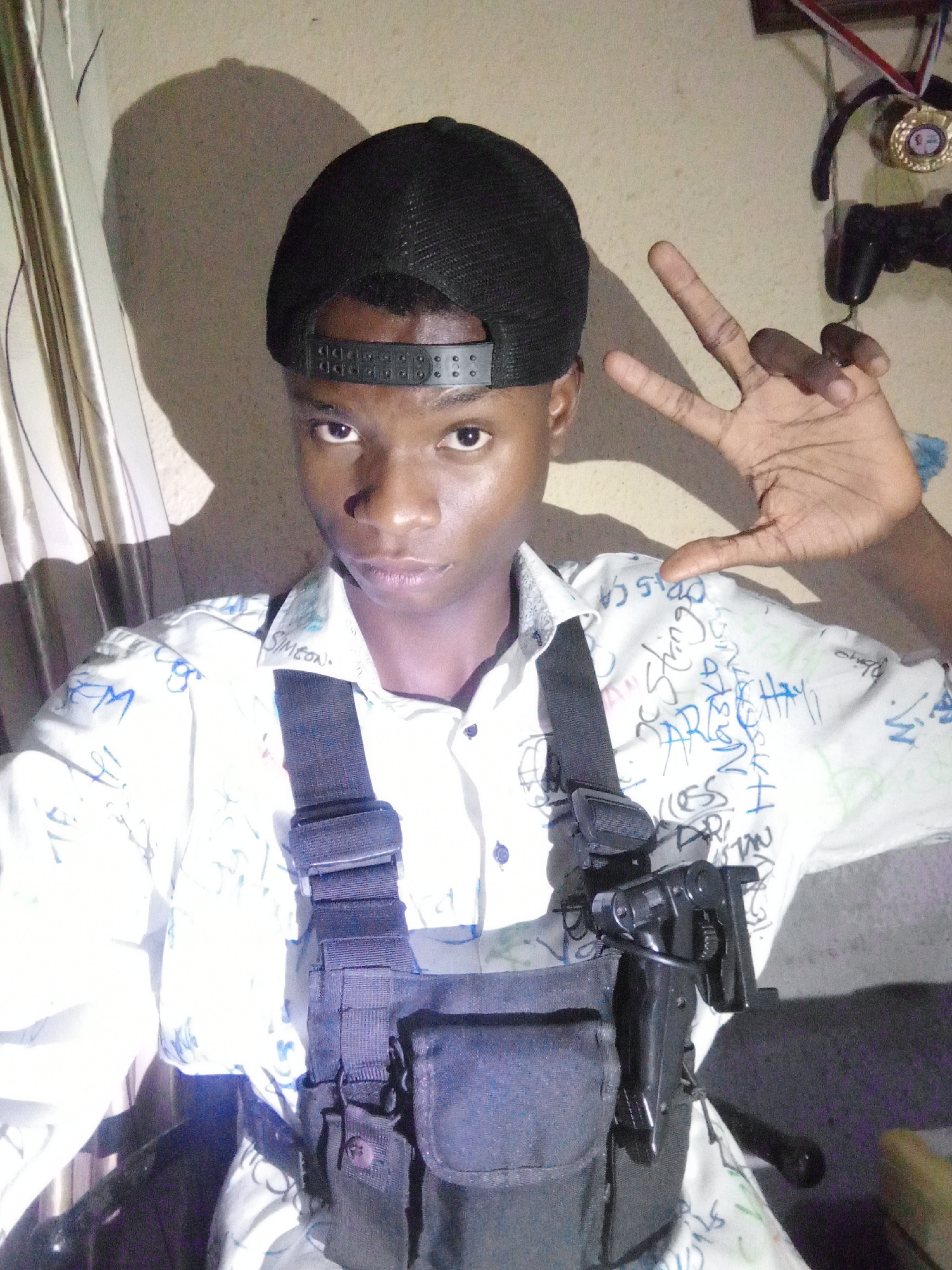 A young man is standing indoors in what appears to be a room. He wears a black baseball cap, a white button-up shirt with writing on it, and a black tactical chest rig with pouches and what seems to b…read more