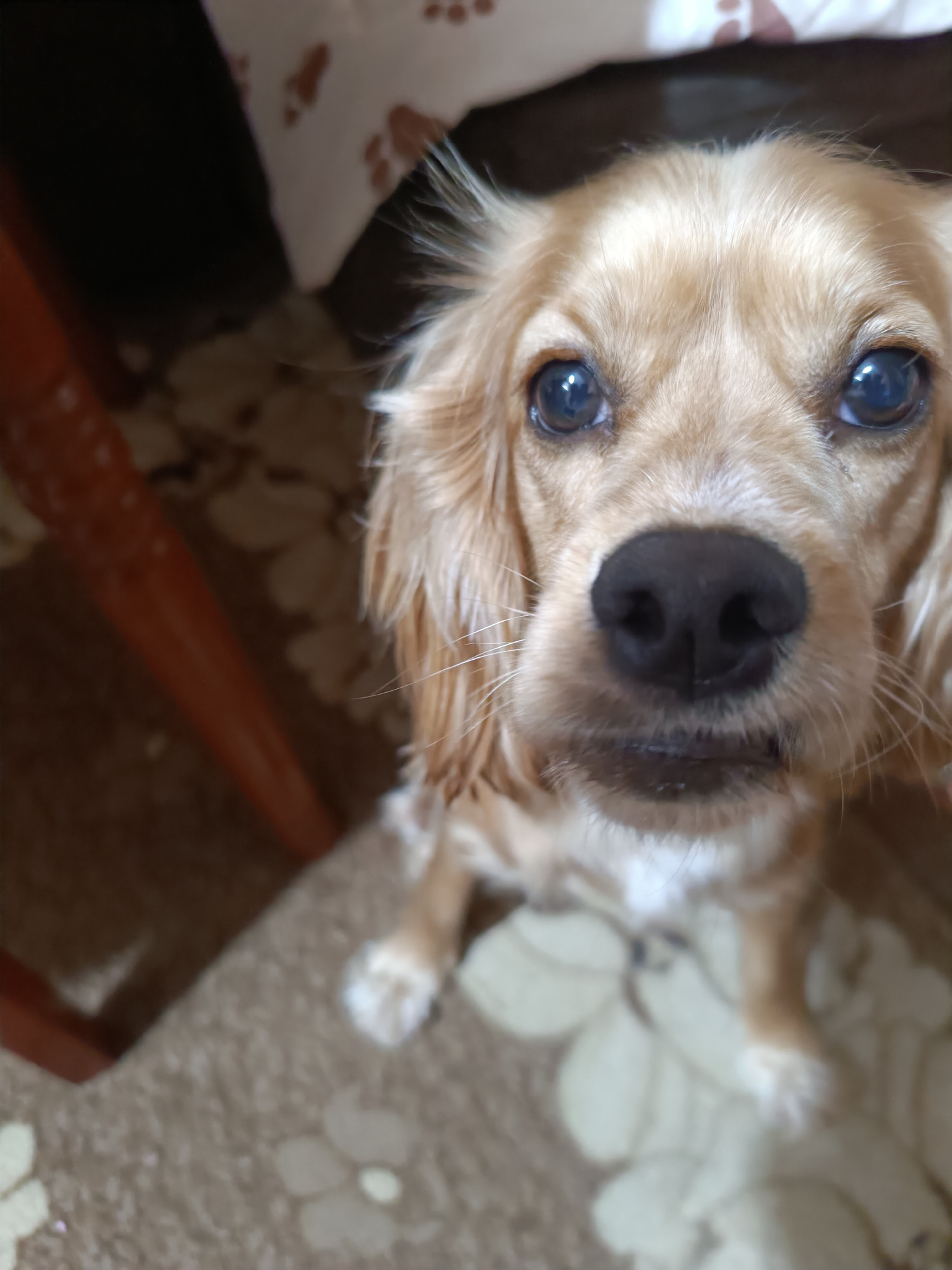 The image is a close-up, high-angle shot of a light-brown and white dog, likely a Cocker Spaniel, sitting on a carpet with a floral pattern. The dog has dark, round eyes and a prominent black nose. A…read more