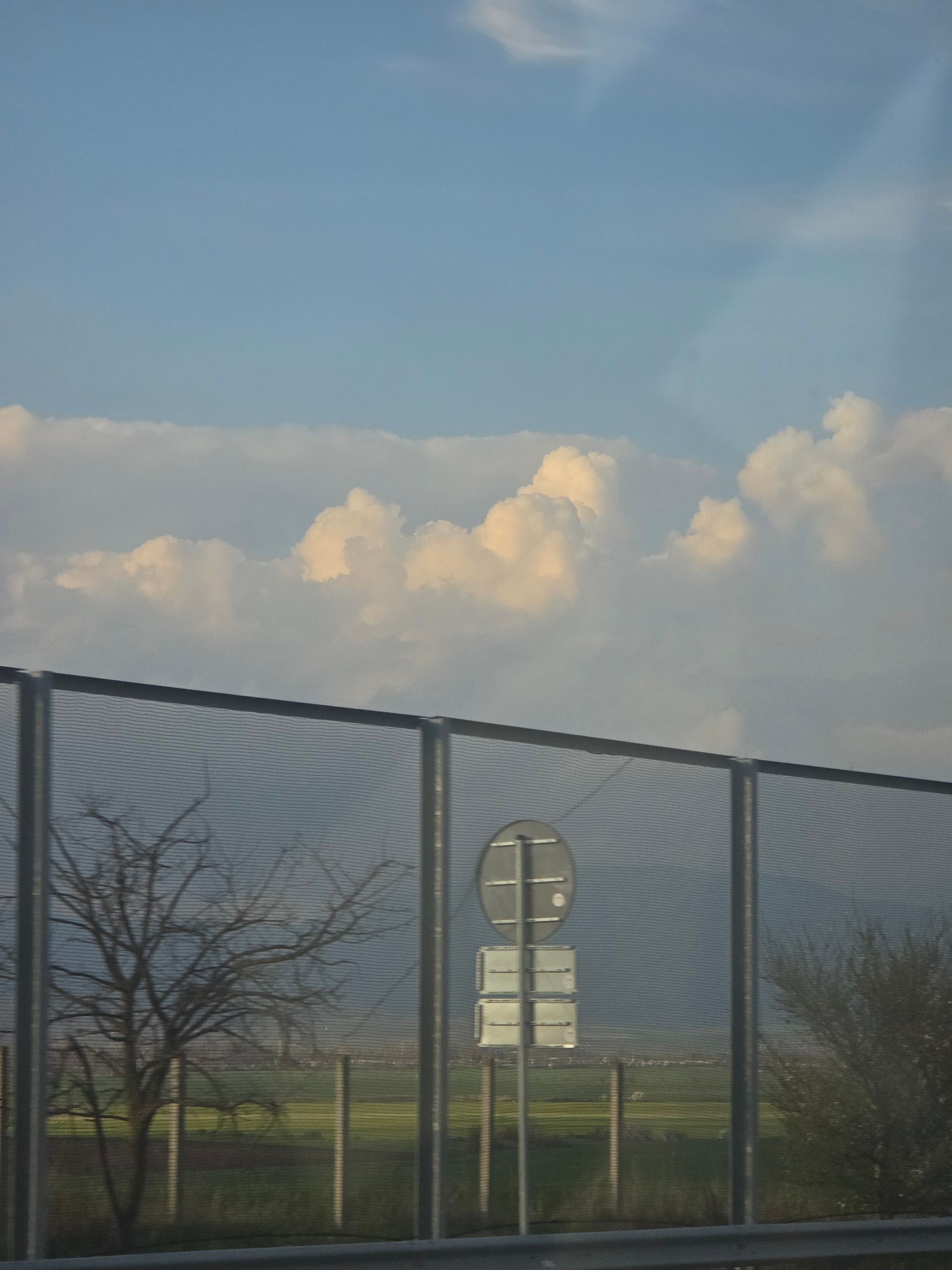 The image shows a view from behind a metal fence. On the left side of the image is a blue sky with white clouds. The right side shows a reflection in the fence, including a road sign, a field, and a t…read more