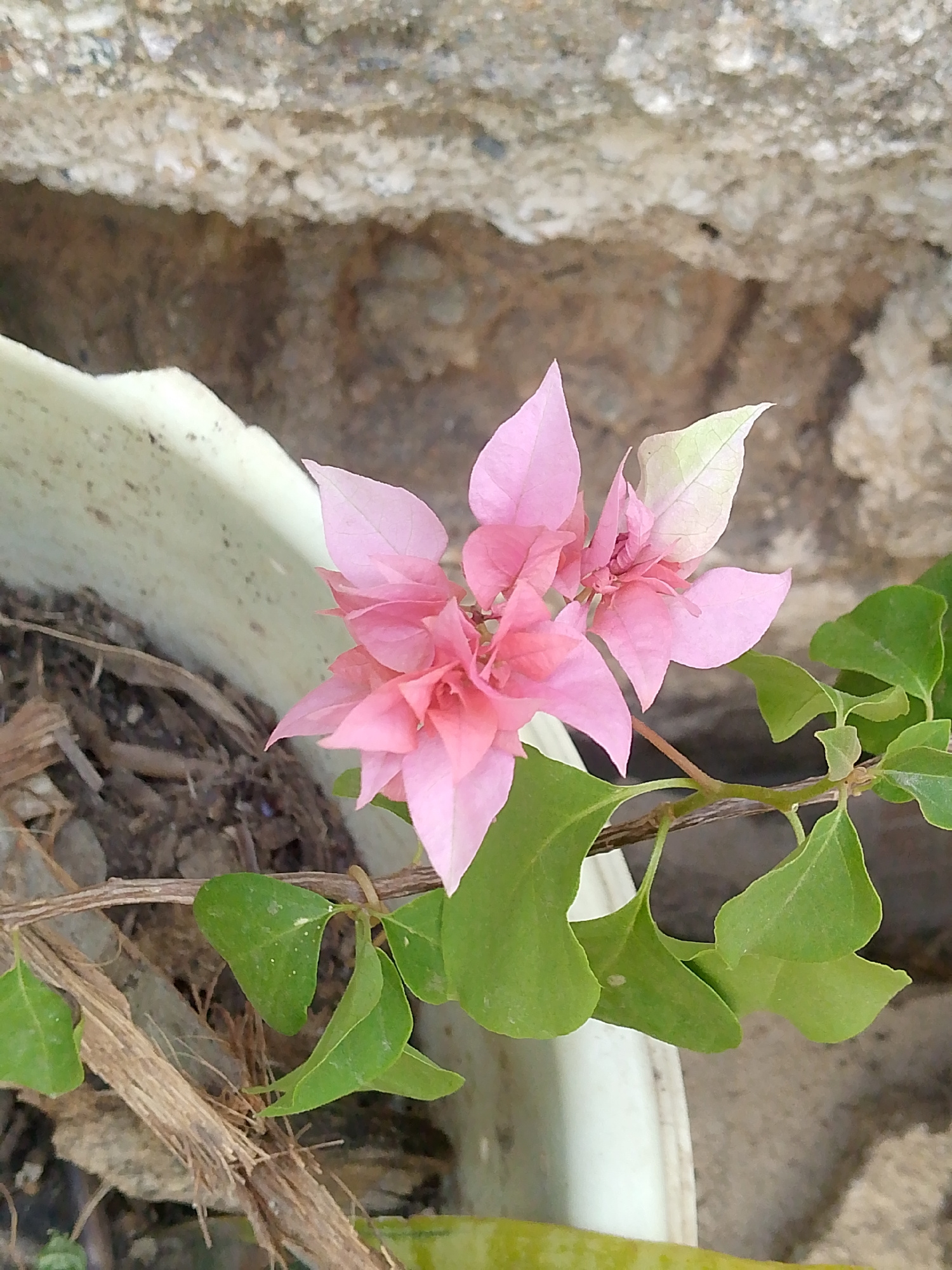 A close-up shot depicts a pink bougainvillea flower in bloom. The flower is the central subject, positioned in front of a rough, concrete wall and the rim of a container holding soil and dried plant m…read more