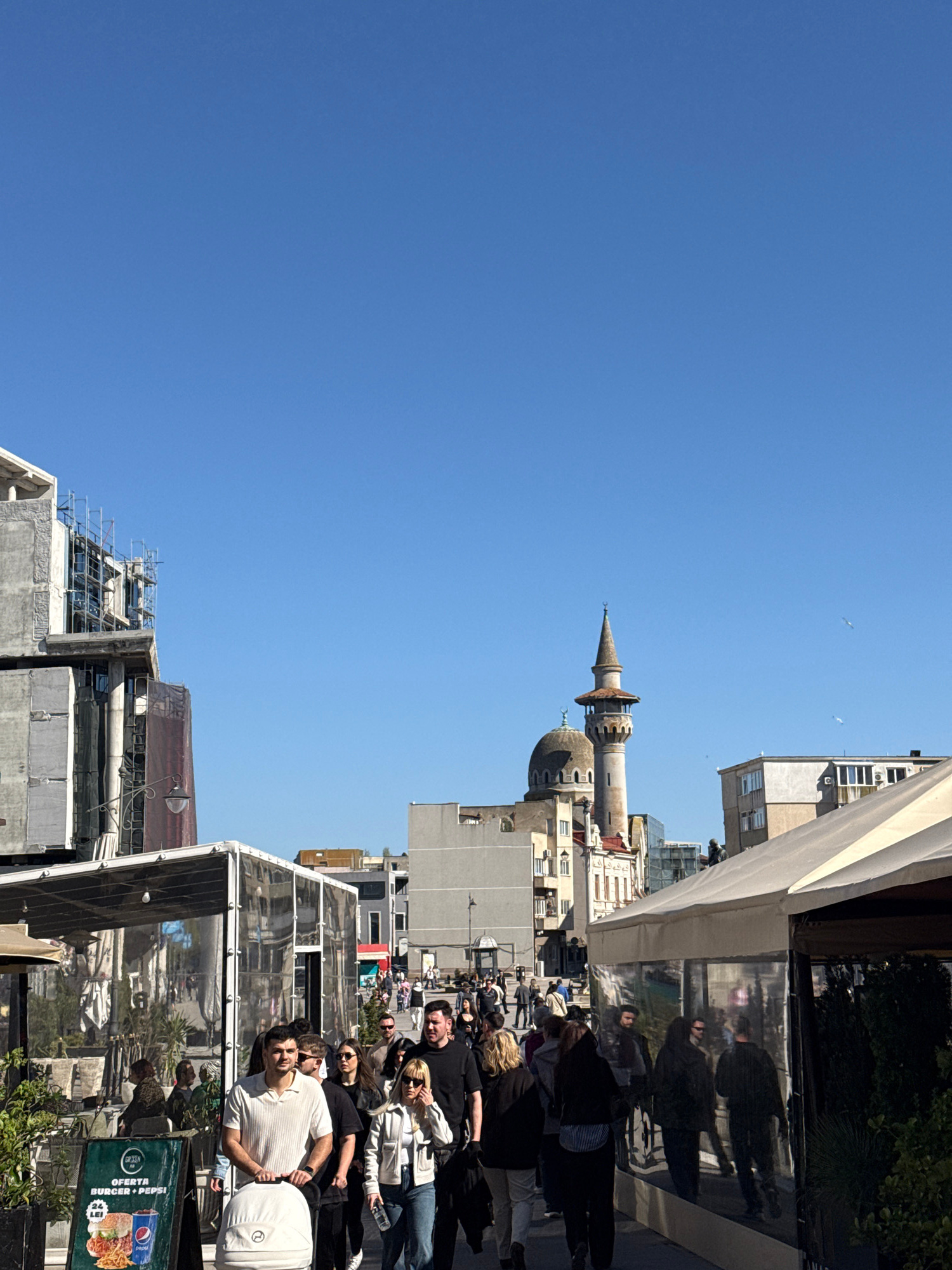 A medium outdoor shot of a narrow street scene in Constanța, Romania, taken on a sunny day. A mosque minaret rises in the center of the frame, between buildings, into a clear blue sky with some airbor…read more