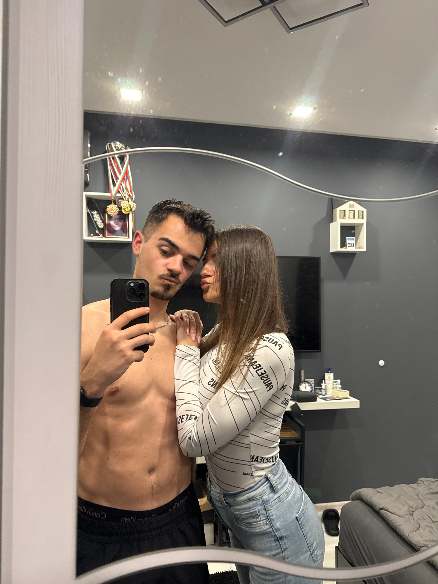 A mirror selfie captures an intimate moment between a man and a woman. The entire image is rotated 90 degrees clockwise from a standard upright orientation, so the subjects appear on their sides. The…read more