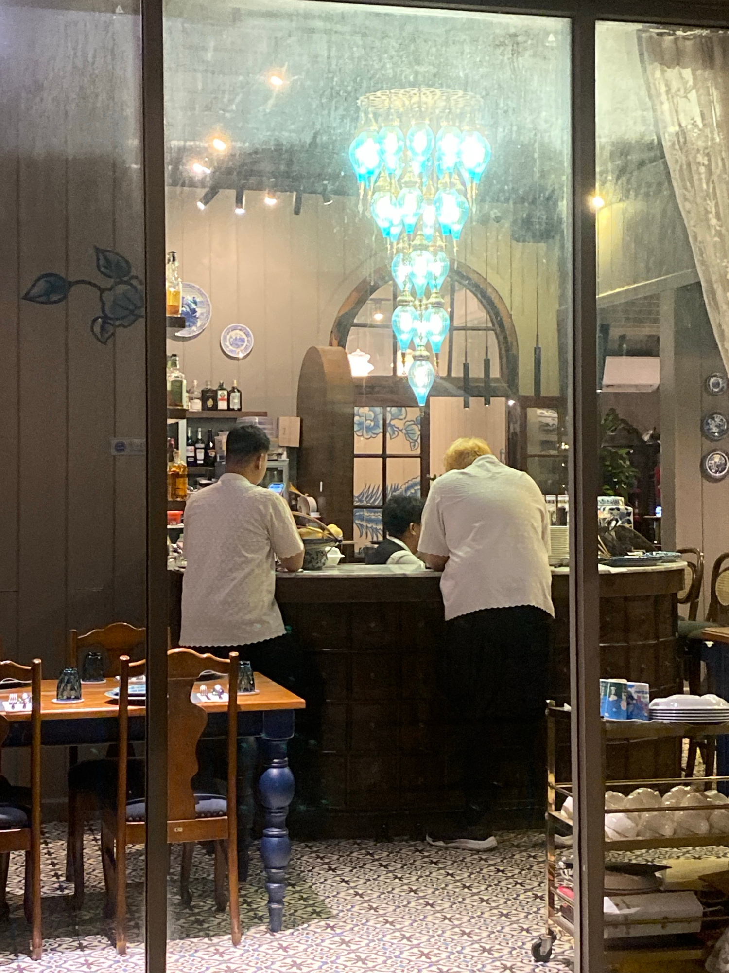 A scene viewed through a glass storefront shows two people at a counter, presumably within a commercial establishment in Choeng Thale, Thailand. One person, with light blonde hair, is wearing a white…read more