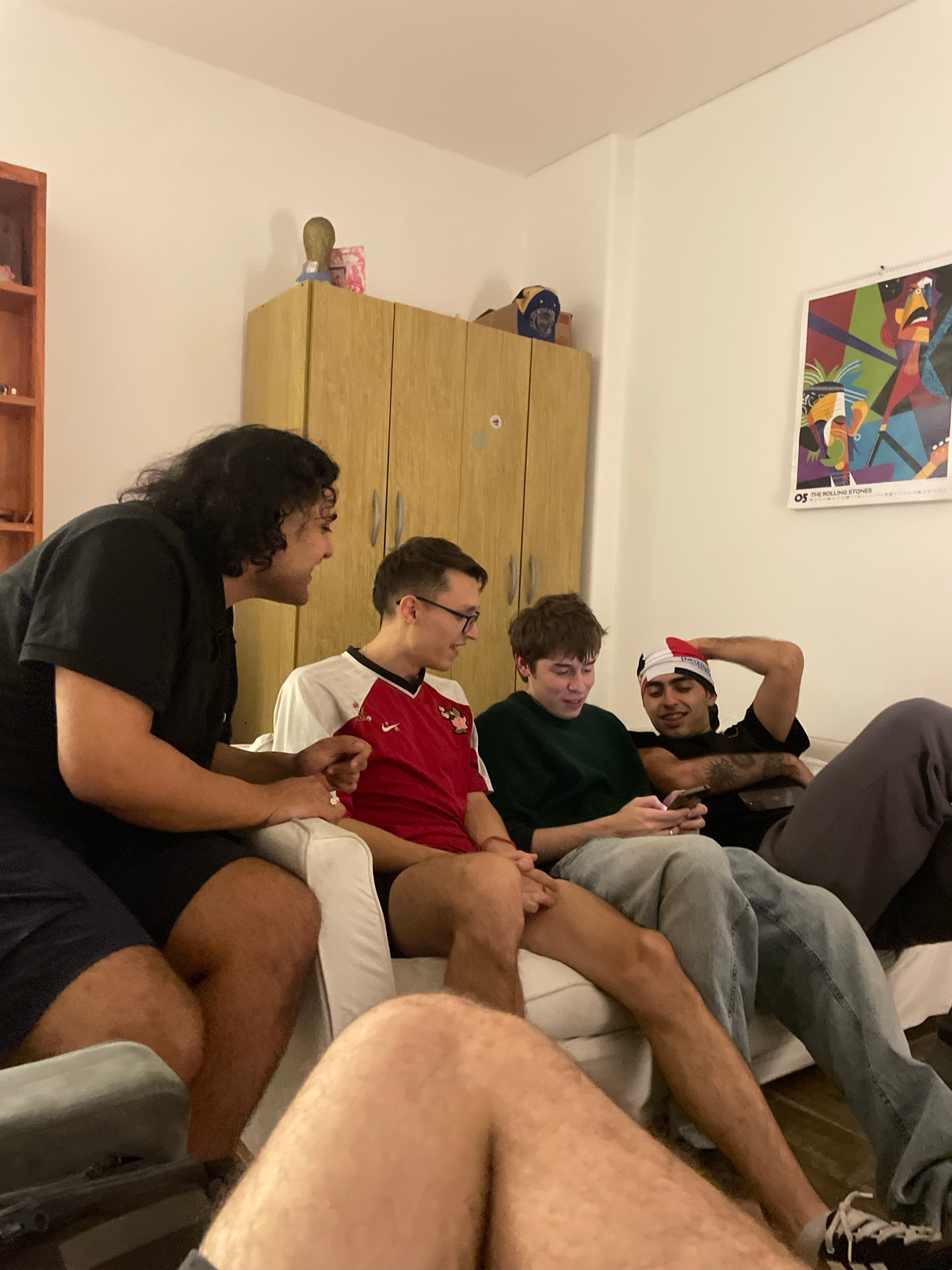 An indoor scene depicts a casual gathering of several young men in what appears to be a living room in Buenos Aires, Argentina. The room has plain white walls and wooden furniture, including a cabinetβ¦read more