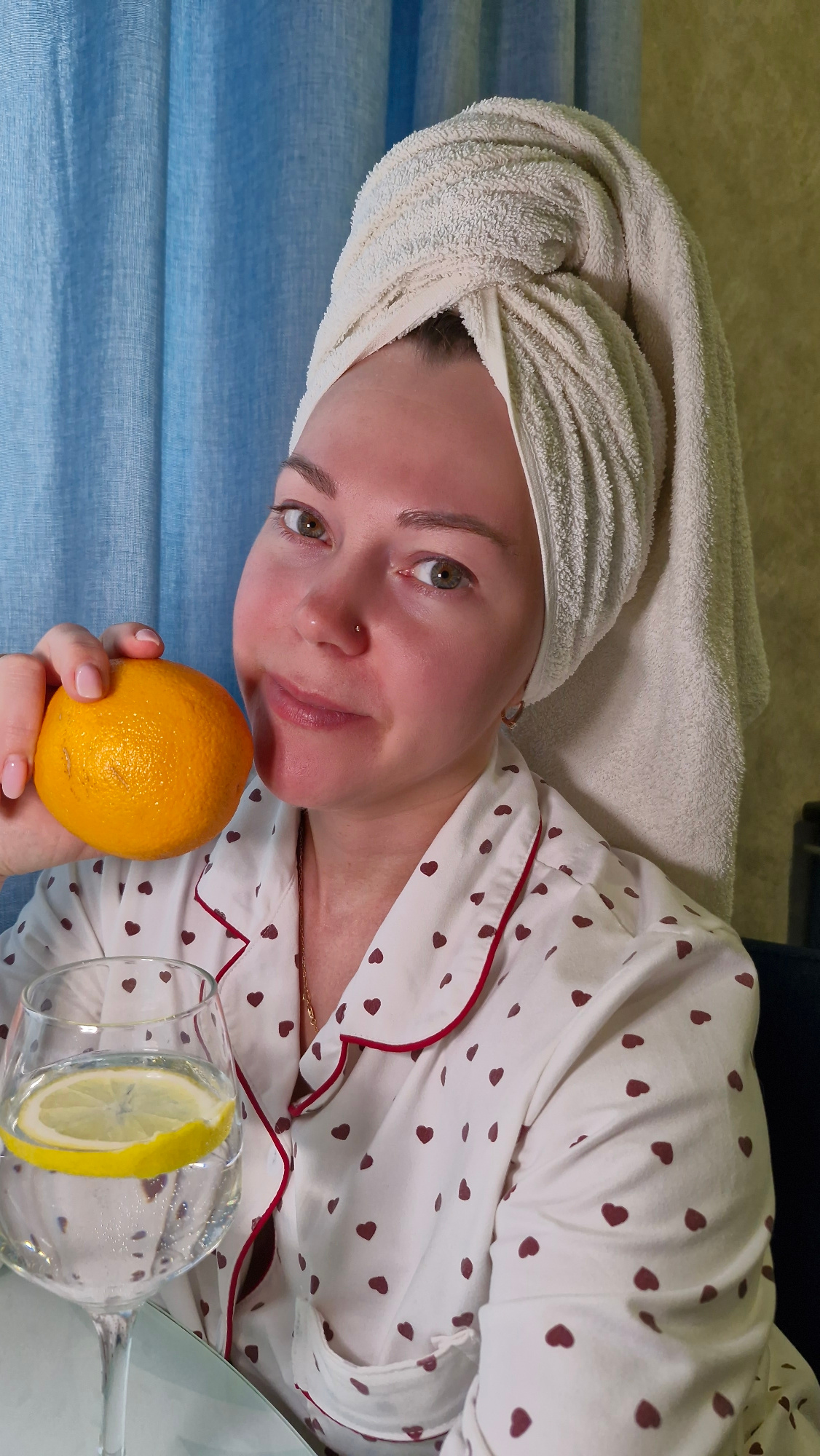 A woman with a towel wrapped around her head holds an orange and a glass of water with a lemon slice. She wears a white pajama top with red heart-shaped patterns and red trim. A light blue curtain isβ¦read more