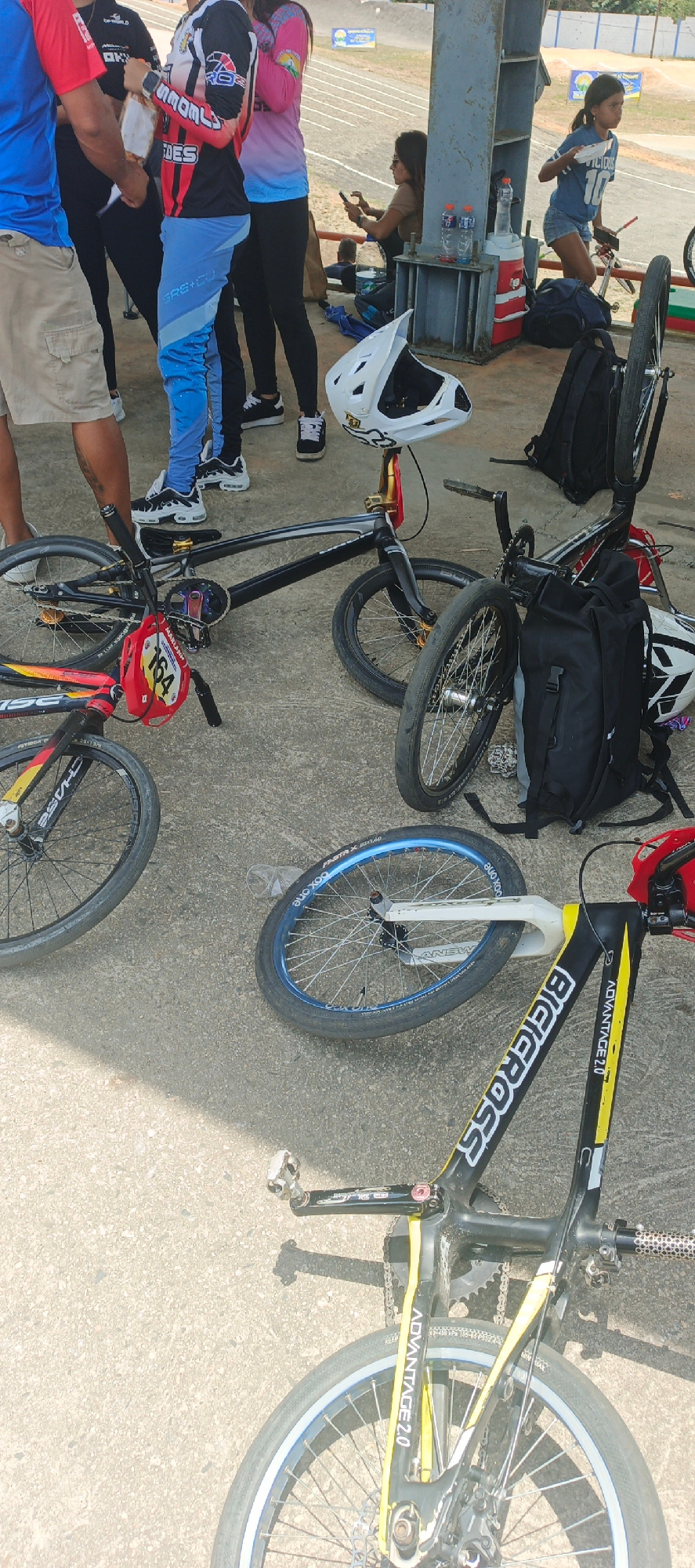 Here is a forensic description of the image: **Location:** The image seems to be in Tinaquillo, Venezuela, at a BMX track or similar race facility. **Scene:** The foreground is filled with several B…read more